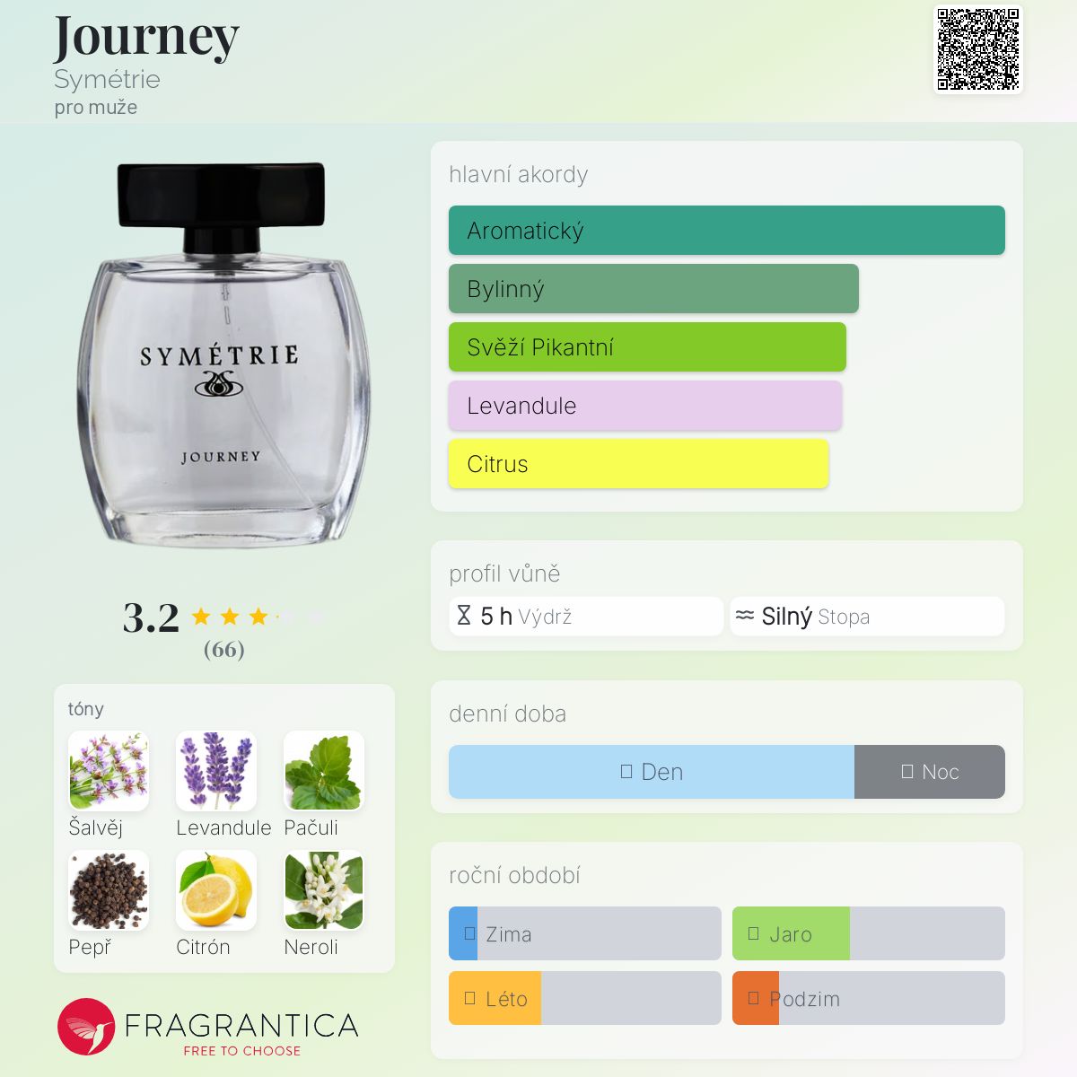 Journey podle Symétrie je vůně pro muže. Journey byl/a uveden/a v roce 2017. Vrchní tóny jsou Levandule, Pepř, Italský citrón a Koriandr; střední tóny jsouŠalvěj, Neroli a Pomerančový květ ; základní tóny jsou List indonéského pačuli, Cedr a Jantar (ambra).