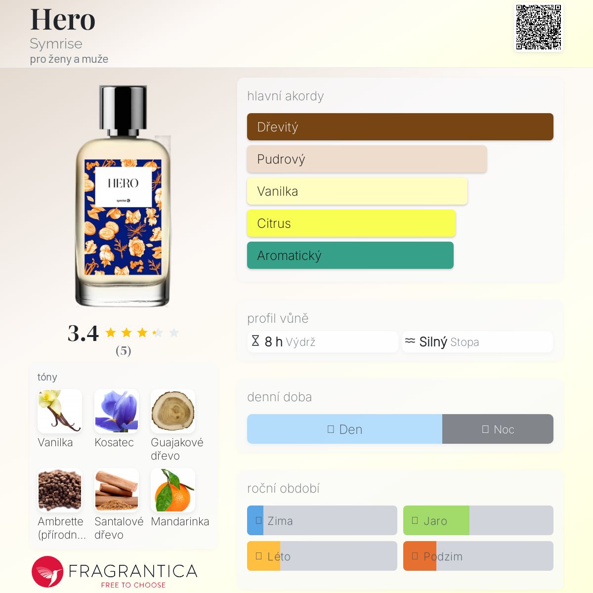 Hero podle Symrise je Citrus Aromatic vůně pro ženy a muže. Hero byl/a uveden/a v roce 2020. Hero byl/a vytvořen/a Maurice Roucel, Annick Menardo, Marine Ipert, Alexandra Carlin, Pierre-Constantin Guéros, Alienor Massenet, Emilie Coppermann, Stéphane Bengana, Nathalie Benareau, Christelle Laprade, Carlos Viñals, David Appel, Patricia Bilodeau, Fanny Grau, Philippe Papare a W. Vrchní tóny jsou Mandarinka, Bergamot, Máta a Zázvor; střední tóny jsouKosatec, Ambrette (přírodní pižmo) a Růže ; základní tóny jsou Vanilka, Guajakové dřevo, Santalové dřevo a Vetiver.