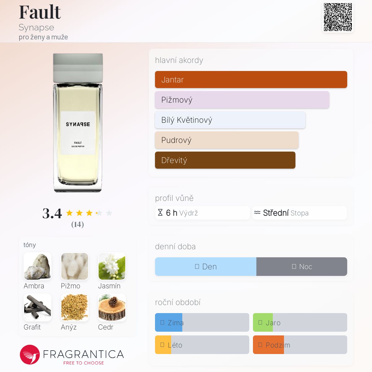 Fault podle Synapse je vůně pro ženy a muže. Fault byl/a uveden/a v roce 2022. Vrchní tóny jsou Ambra, Jasmín, Grafit, Anýz, Mandarinka a Kadidlo; střední tóny jsouAmbra, Pižmo, Jasmín, Grafit, Cedr, Cedrové listy a Kadidlo ; základní tóny jsou Ambra, Pižmo, Cedr a Vanilka.