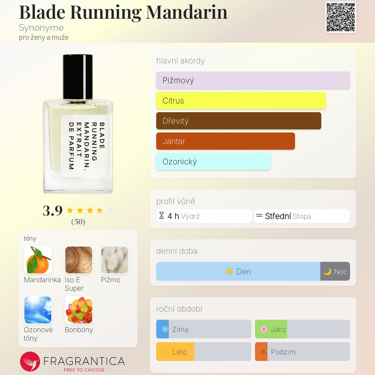 Blade Running Mandarin podle Synonyme je Citrus vůně pro ženy a muže. Blade Running Mandarin byl/a uveden/a v roce 2024. Vrchní tóny jsou Mandarinka a Ozonové tóny; střední tóny jsouPižmo a Sladké tóny ; základní tón je Iso E Super.