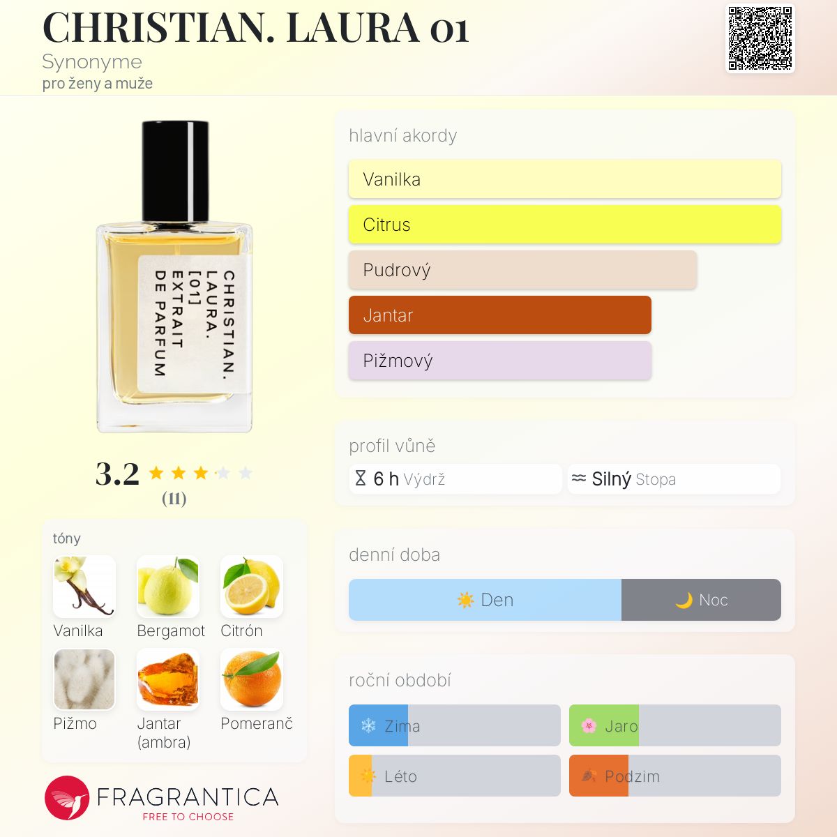 CHRISTIAN. LAURA 01 podle Synonyme je Orientální vůně pro ženy a muže. Vrchní tóny jsou Kalábrijský bergamot, Sicilský citron a Sicilský pomeranč; střední tón jeOvocné tóny ; základní tóny jsou Madagaskarská vanilka, Bílé pižmo a Jantar (ambra).