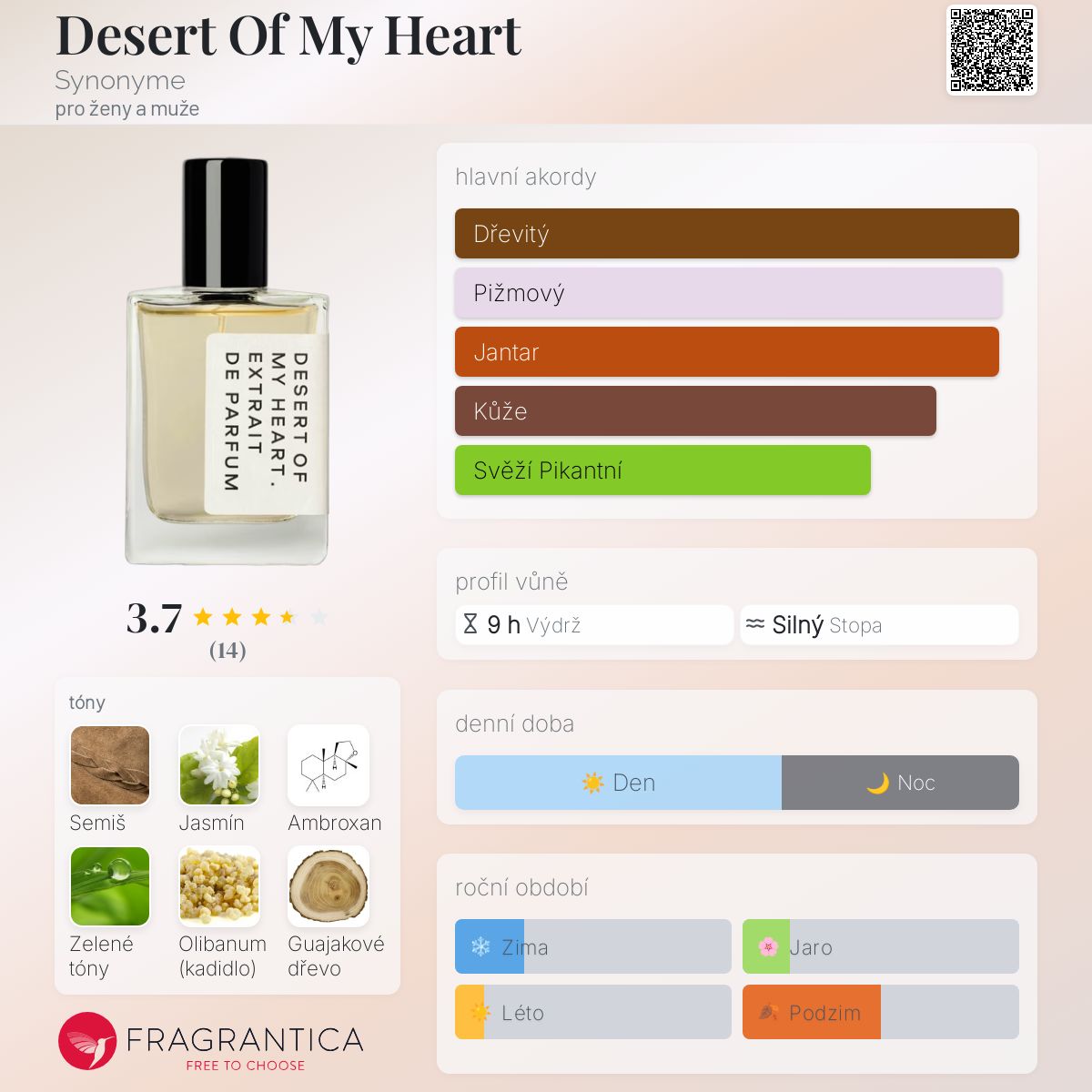 Desert Of My Heart podle Synonyme je vůně pro ženy a muže. Toto je nová vůně. Desert Of My Heart byl/a uveden/a v roce 2025. "Nosem" za touto vůní je Marc Daniel Heimgartner. Vrchní tóny jsou Bylinné tóny, Olibanum, Bergamot, Cypřiš a Aromatické tóny; střední tóny jsouJasmín, Guajakové dřevo, Fialkový list, Kůže, Pelargónie a Agarové dřevo (oud) ; základní tóny jsou Semiš, Ambroxan, Kašmírové dřevo, Cedr, Bílé pižmo, Karamel a Pačuli.