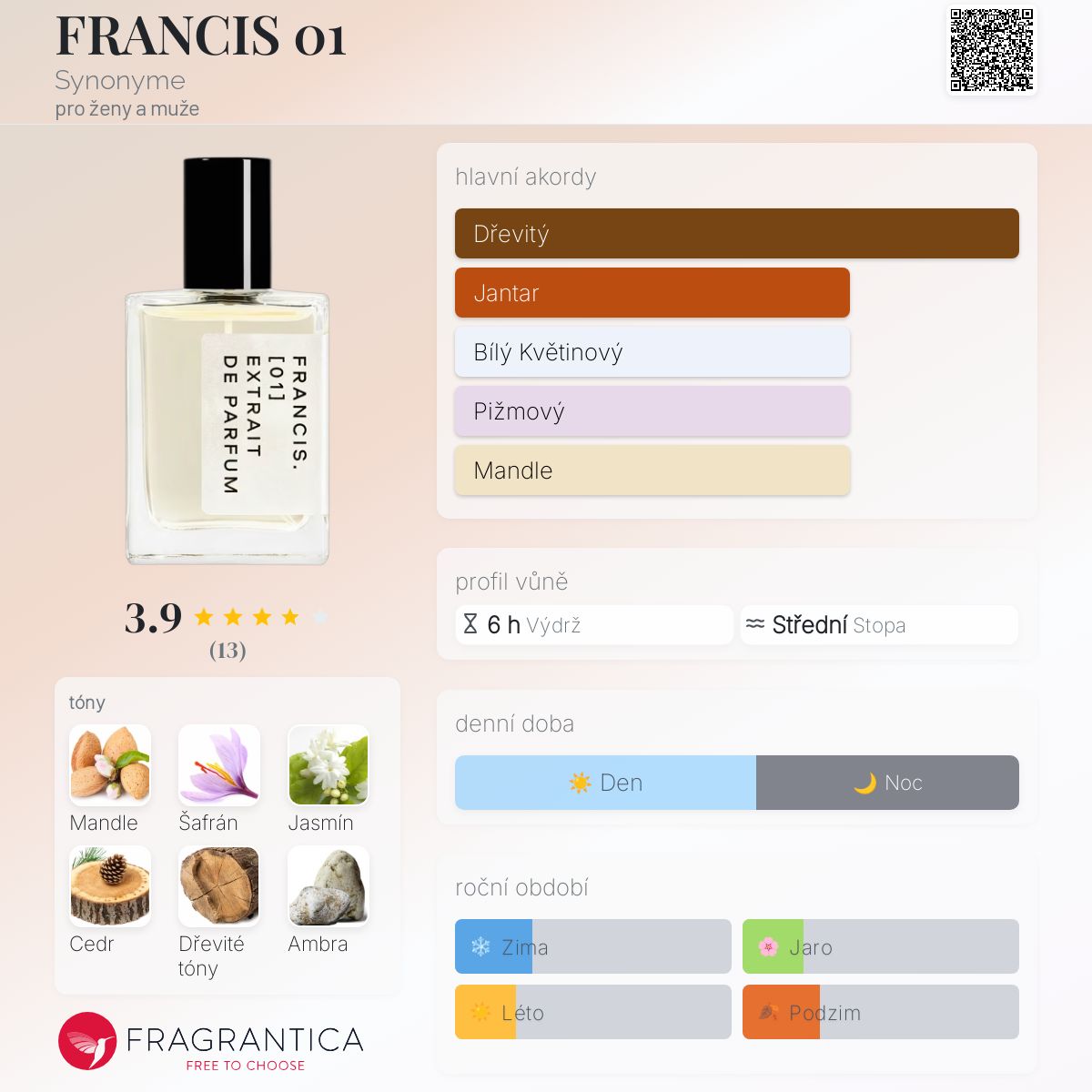 FRANCIS 01 podle Synonyme je Orientální Floral vůně pro ženy a muže. Vrchní tóny jsou Hořká mandle a Šafrán; střední tóny jsouEgyptský jasmín a Cedr ; základní tóny jsou Dřevité tóny, Ambra a Pižmo.