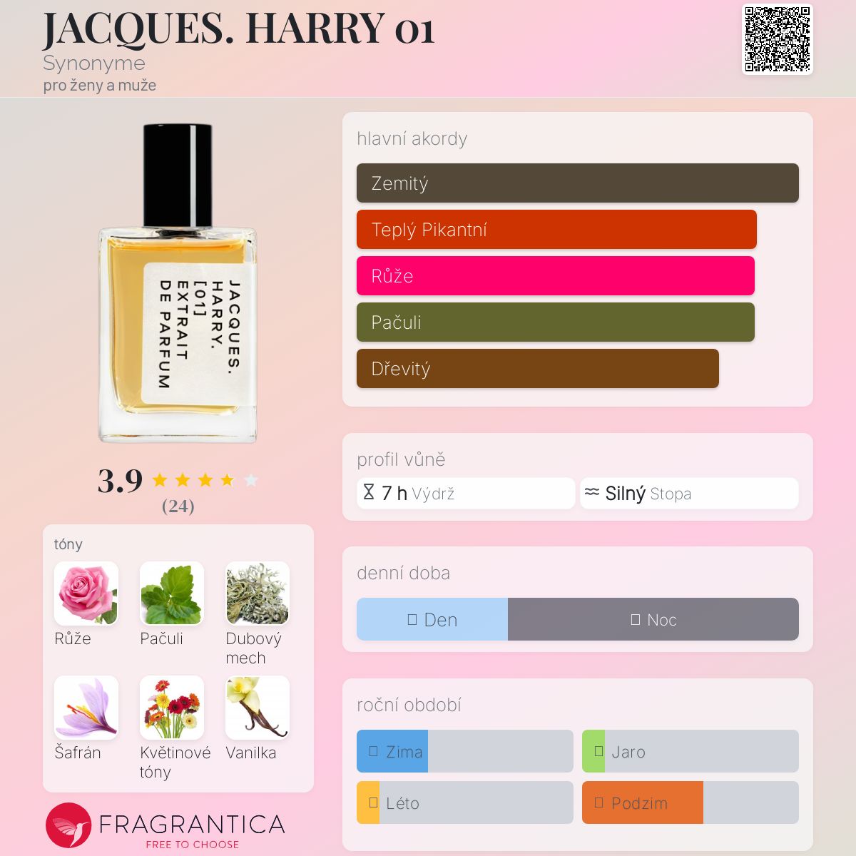 JACQUES. HARRY 01 podle Synonyme je Chypre vůně pro ženy a muže. Vrchní tón je Šafrán ; střední tóny jsouČerná růže, Květinové tóny a Lanýž ; základní tóny jsou Pačuli, Dubový mech a Vanilka.
