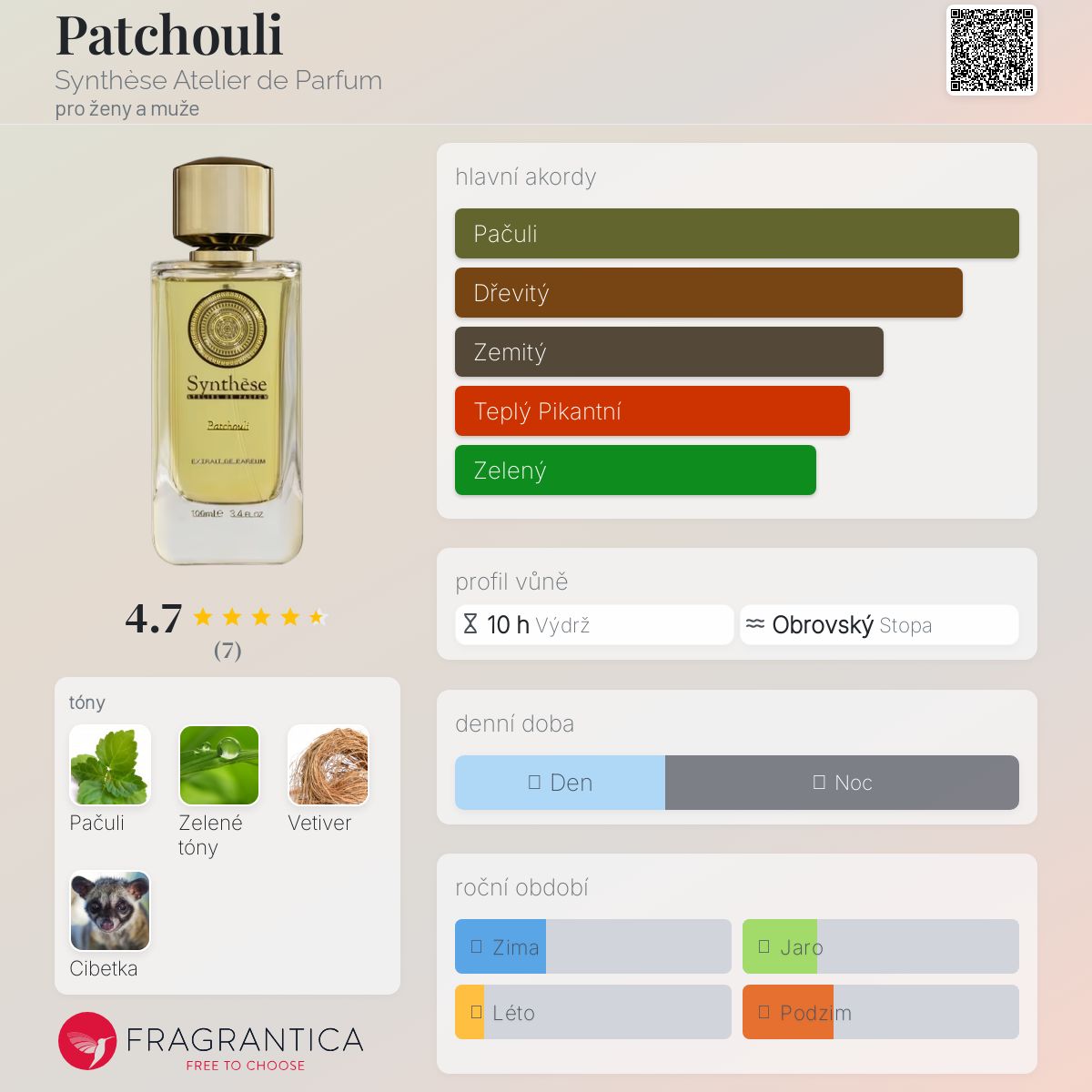 Patchouli podle Synthèse Atelier de Parfum je Aromatic vůně pro ženy a muže. Patchouli byl/a uveden/a v roce 2019. "Nosem" za touto vůní je Abdullah Kuruş. Vrchní tón je Pačuli ; střední tón jeZelené tóny ; základní tóny jsou Vetiver a Cibetka.