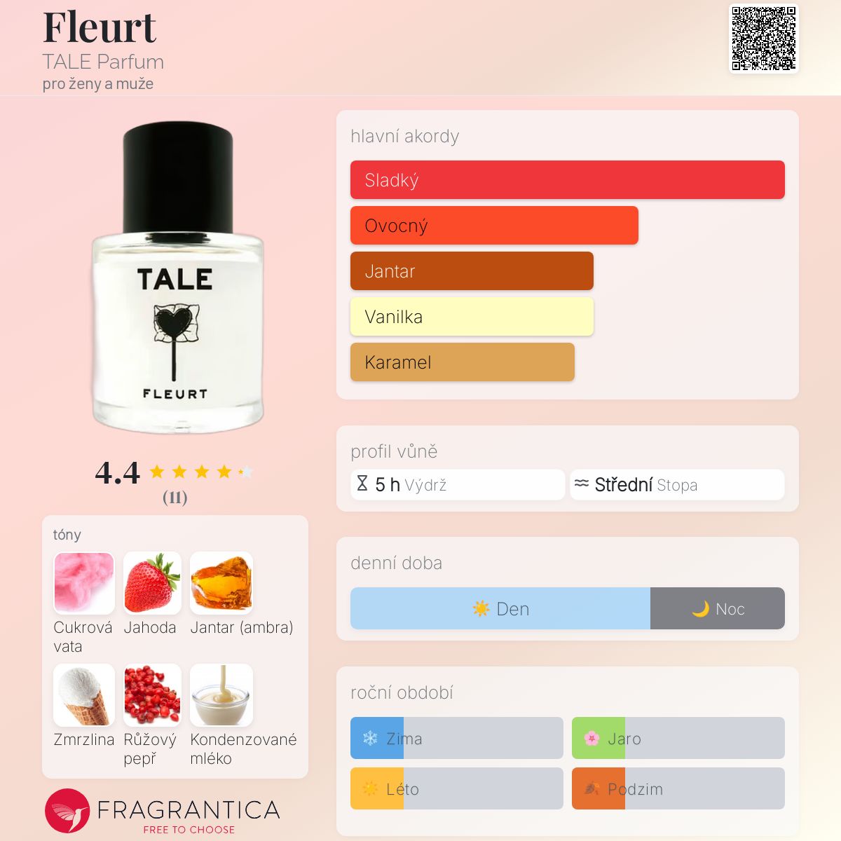 Fleurt podle TALE Parfum je Floral Fruity vůně pro ženy a muže. Toto je nová vůně. Fleurt byl/a uveden/a v roce 2024. Vrchní tóny jsou Růžový pepř, Broskev a Růžový grapefruit; střední tóny jsouCukrová vata, Jahoda a Polní květiny ; základní tóny jsou Jantar (ambra), Zmrzlina, Kondenzované mléko, Vanilka a Mandle.