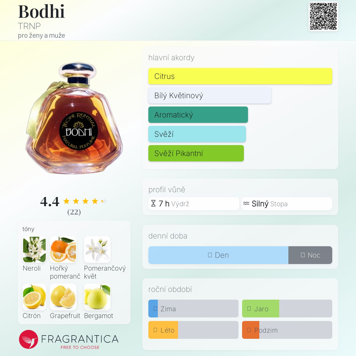 Bodhi podle TRNP je Chypre Floral vůně pro ženy a muže. Bodhi byl/a uveden/a v roce 2016. "Nosem" za touto vůní je Teone Reinthal. Vrchní tóny jsou Hořký pomeranč, Citrón, Růžový grapefruit a Bergamot; střední tóny jsouNeroli, Pomerančový květ a Růžový lotos ; základní tóny jsou Galbanum, Pačuli a Rozmarýn.