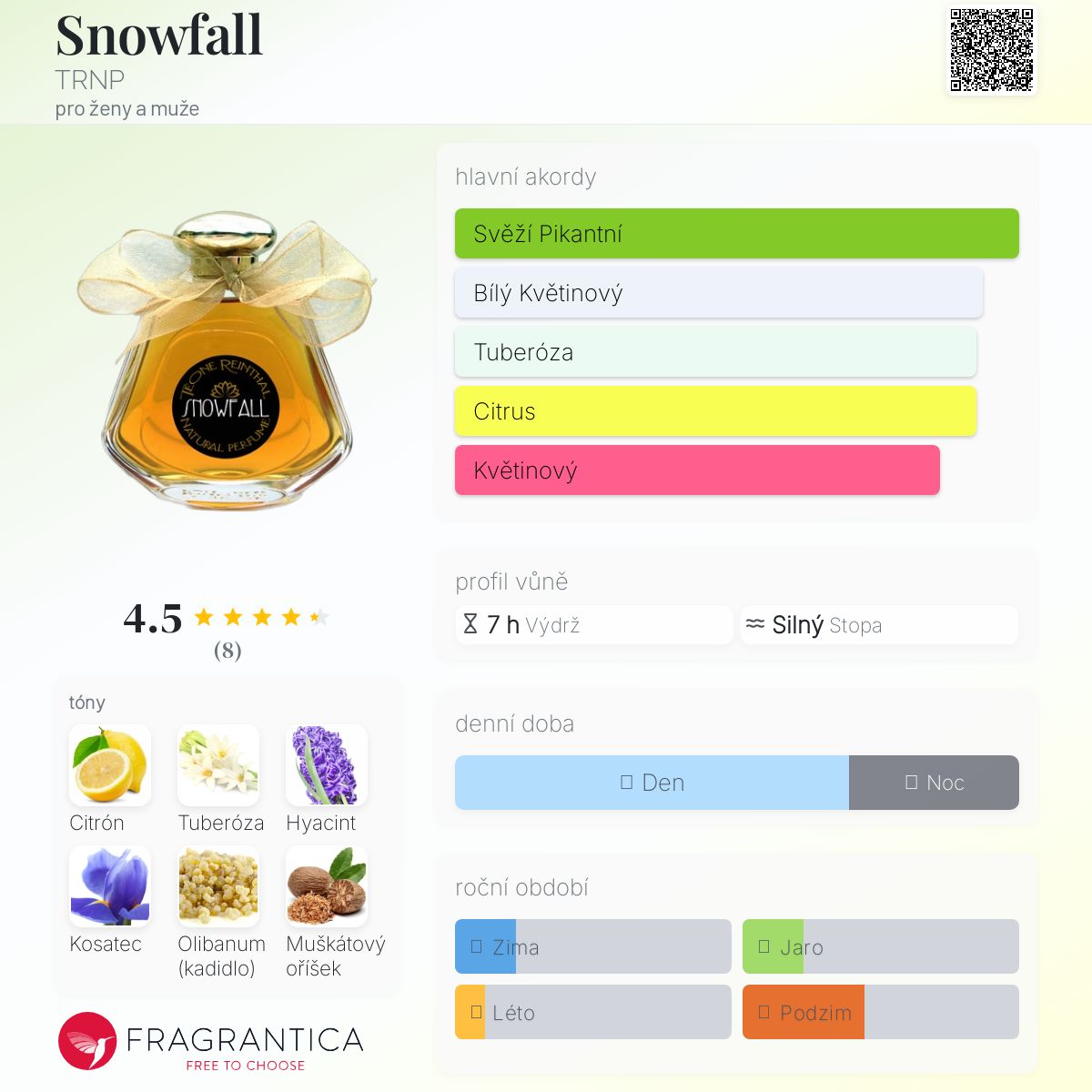 Snowfall podle TRNP je Chypre Floral vůně pro ženy a muže. Snowfall byl/a uveden/a v roce 2016. "Nosem" za touto vůní je Teone Reinthal.