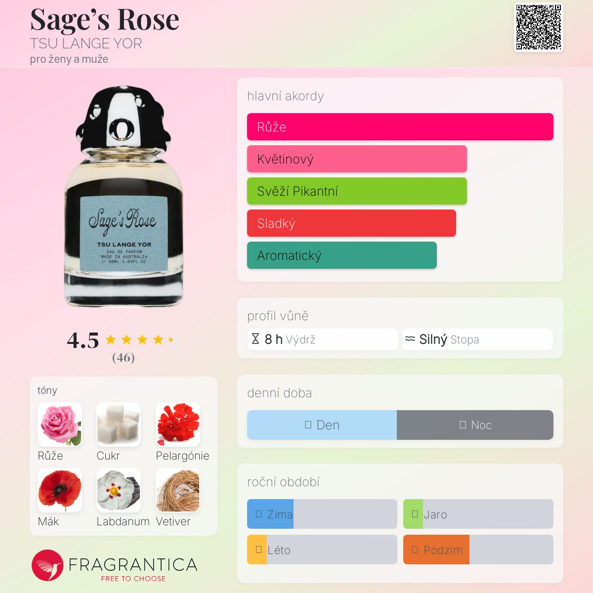 Sage’s Rose podle TSU LANGE YOR je vůně pro ženy a muže. Toto je nová vůně. Sage’s Rose byl/a uveden/a v roce 2025. Vrchní tóny jsou Cukr, Labdanum a Myrha; střední tóny jsouDamašská růže, Pelargónie a Mák ; základní tóny jsou Vetiver, Jantar (ambra), Pryskyřice a Pačuli.