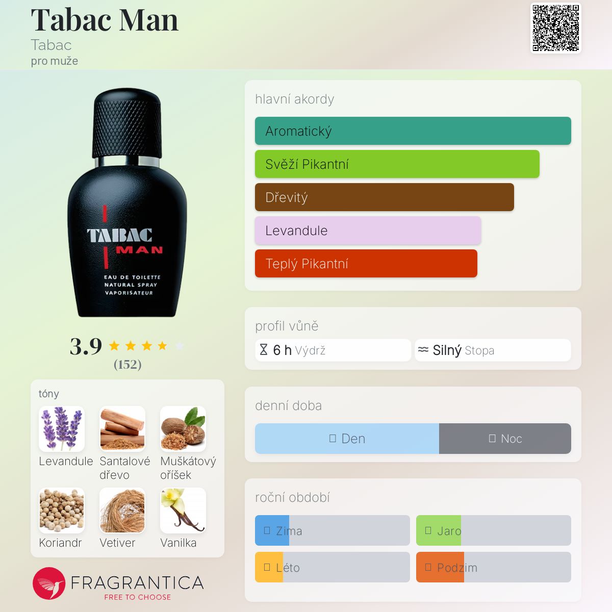 Tabac Man podle Tabac je Aromatic Fougere vůně pro muže. Vrchní tóny jsou Levandule, Pomeranč, Bergamot a Máta; střední tóny jsouKoriandr, Vetiver, Kardamom a Pelargónie ; základní tóny jsou Santalové dřevo, Muškátový oříšek, Vanilka a Pačuli.