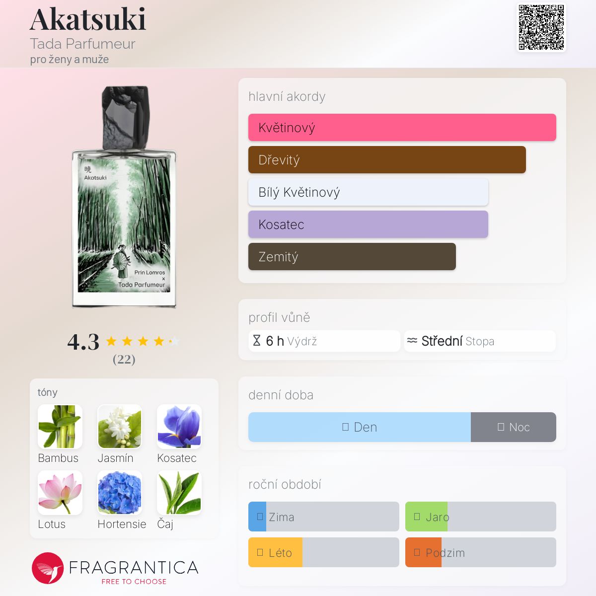 Akatsuki podle Tada Parfumeur je vůně pro ženy a muže. Akatsuki byl/a uveden/a v roce 2023. Akatsuki byl/a vytvořen/a Tada Archawong a Prin Lomros. Vrchní tóny jsou Bambus, Grapefruit, Vodní tóny a Meloun; střední tóny jsouJasmín, Kosatec, Galbanum a Rajčatový list ; základní tóny jsou Lotus, Hortensie a Zelený čaj.