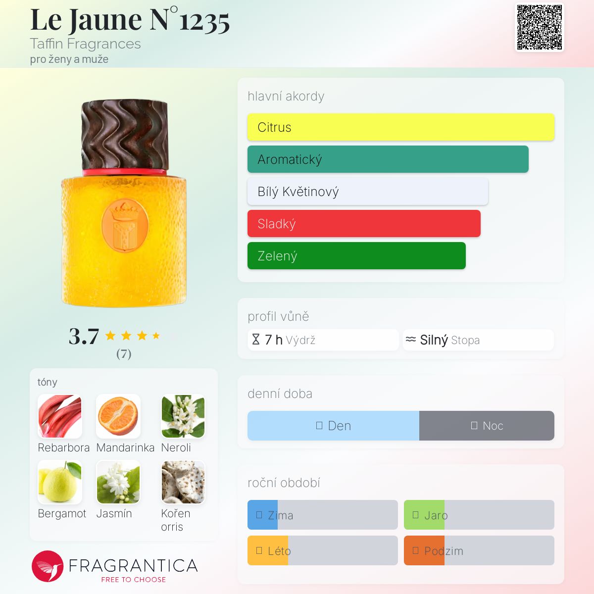Le Jaune N°1235 podle Taffin Fragrances je vůně pro ženy a muže. Le Jaune N°1235 byl/a uveden/a v roce 2022. Le Jaune N°1235 byl/a vytvořen/a Yves Cassar, Pascal Gaurin a Dominique Ropion. Vrchní tóny jsou Rebarbora, Mandarinka, Neroli a Bergamot; střední tóny jsouJasmín, Orris a Tabák ; základní tóny jsou Haitský vetiver, Ambrette (přírodní pižmo) a Fazole tonka.