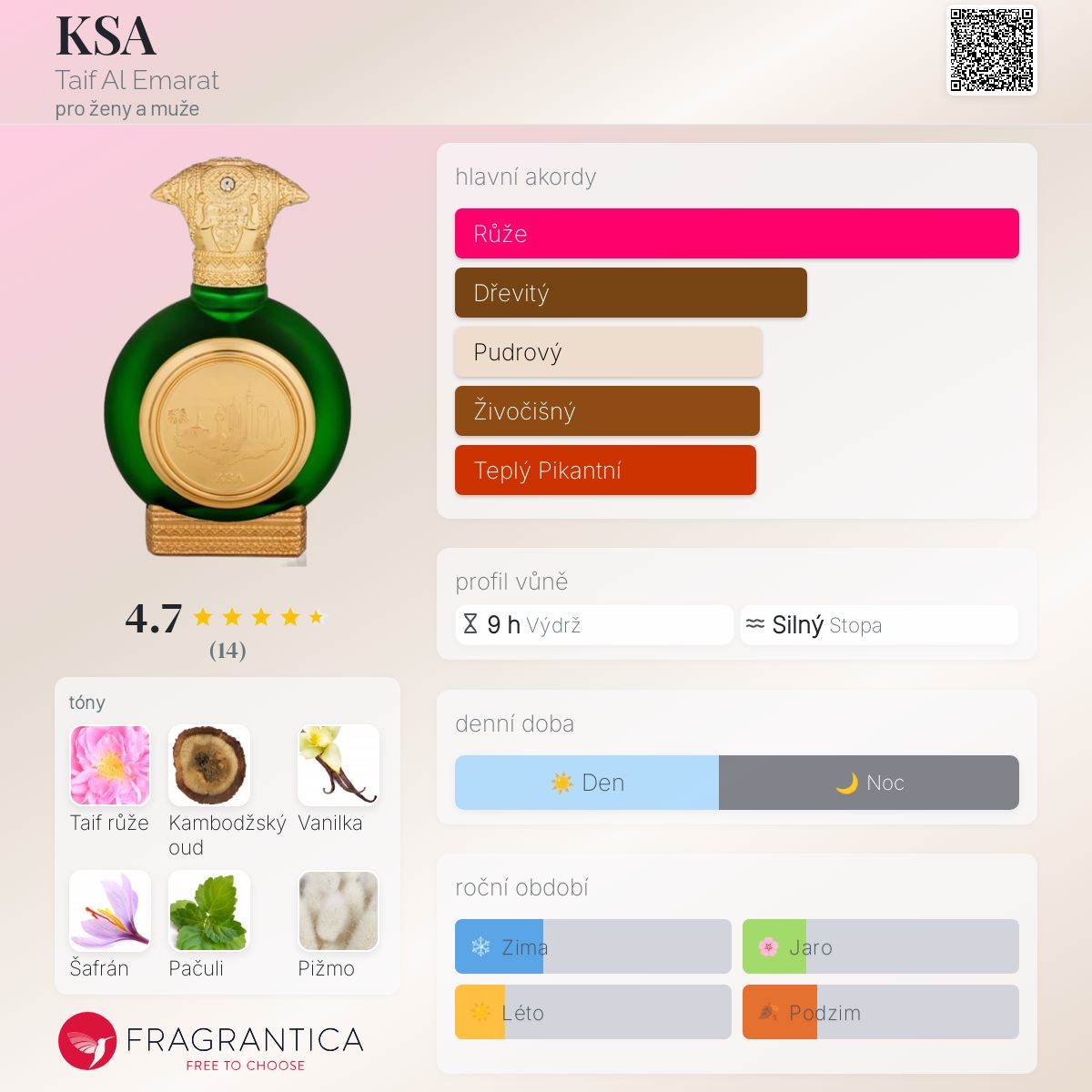 KSA podle Taif Al Emarat je vůně pro ženy a muže. Vrchní tóny jsou Šafrán a Pižmo; střední tóny jsouVanilka a Pačuli ; základní tóny jsou Taif růže a Kambodžský oud.