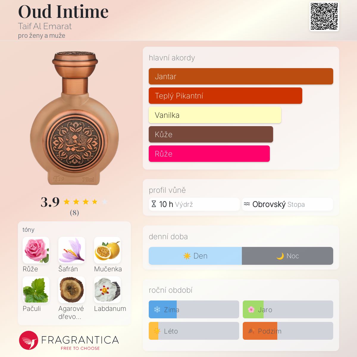 Oud Intime podle Taif Al Emarat je Orientální Woody vůně pro ženy a muže. Toto je nová vůně. Oud Intime byl/a uveden/a v roce 2024. Vrchní tóny jsou Turecká růže, Šafrán a Mučenka; střední tóny jsouPačuli, Agarové dřevo (oud), Agarové dřevo (oud) a Benzoin ; základní tóny jsou Labdanum, Vanilka, Kůže a Jantar (ambra).