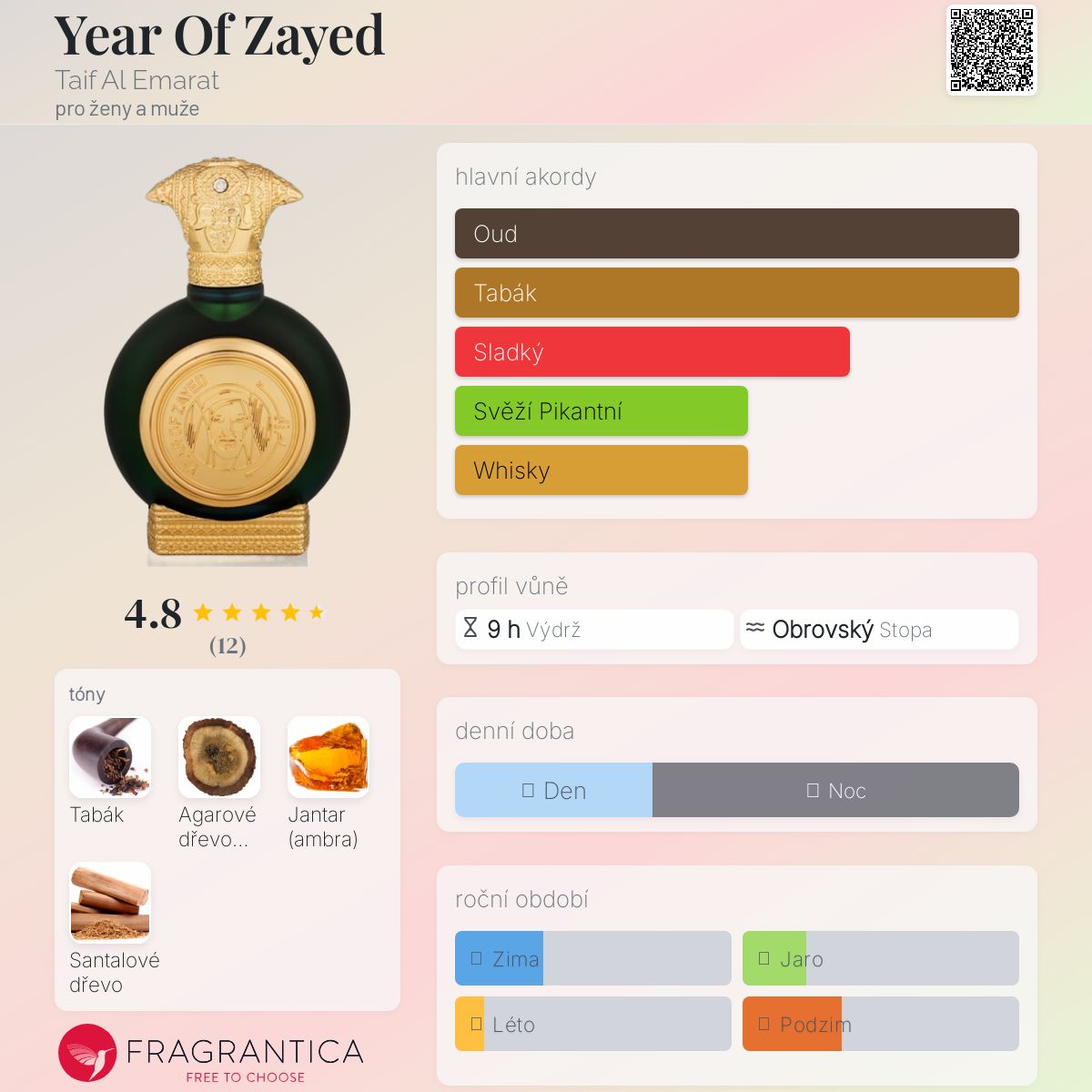 Year Of Zayed podle Taif Al Emarat je vůně pro ženy a muže. Vrchní tóny jsou Tabák a Jantar (ambra); střední tón jeAgarové dřevo (oud) ; základní tón je Santalové dřevo.