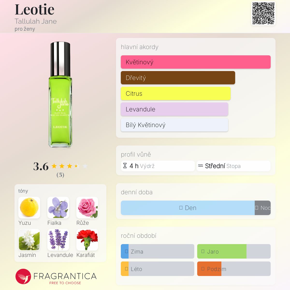 Leotie podle Tallulah Jane je Floral vůně pro ženy. Leotie byl/a uveden/a v roce 2010. Vrchní tóny jsou Yuzu a Fialka; střední tóny jsouRůže, Jasmín, Levandule a Karafiát ; základní tóny jsou Dřevité tóny, Fialkový list a Fazole tonka.
