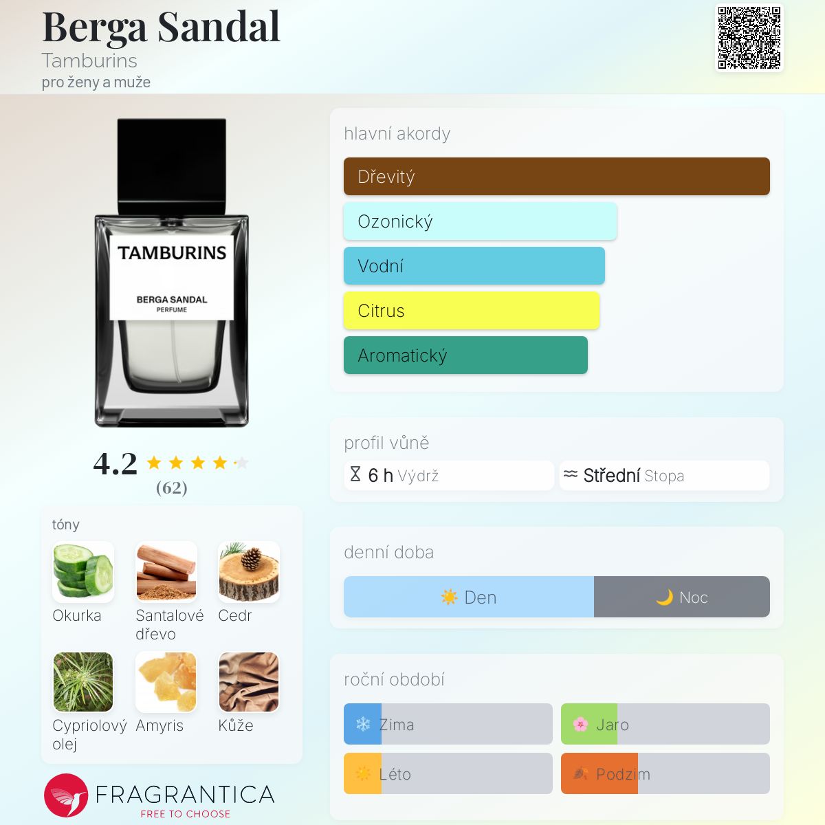 Berga Sandal podle Tamburins je Woody Aromatic vůně pro ženy a muže. Berga Sandal byl/a uveden/a v roce 2022. Vrchní tóny jsou Bergamot, Limetka a Kardamom; střední tóny jsouOkurka, Atlasový cedr a Cypriolový olej ; základní tóny jsou Santalové dřevo, Amyris a Kůže.