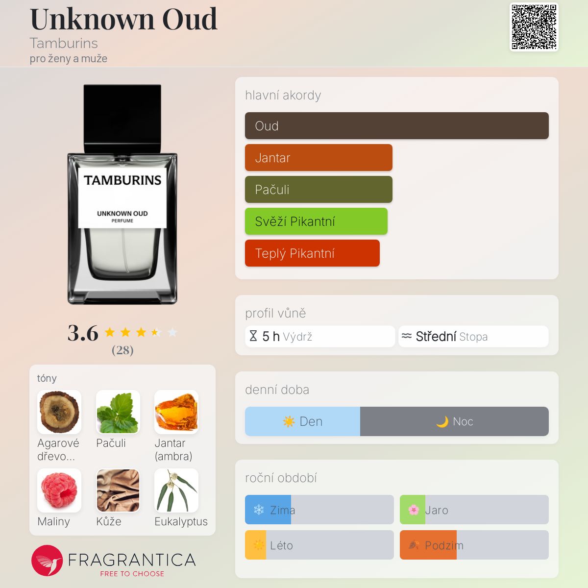 Unknown Oud podle Tamburins je Orientální Woody vůně pro ženy a muže. Unknown Oud byl/a uveden/a v roce 2022. Vrchní tóny jsou Eukalyptus a Levandule; střední tóny jsouMaliny a Kůže ; základní tóny jsou Agarové dřevo (oud), Pačuli a Jantar (ambra).