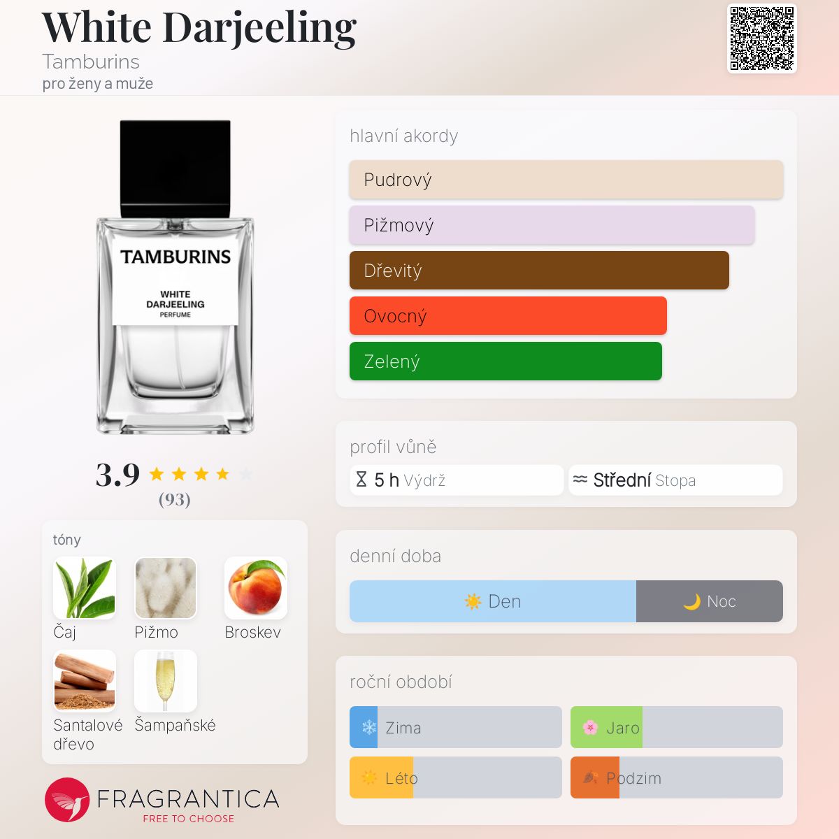 White Darjeeling podle Tamburins je Aromatic Green vůně pro ženy a muže. White Darjeeling byl/a uveden/a v roce 2022. Vrchní tón je Šampaňské ; střední tóny jsouČerný čaj a Broskev ; základní tóny jsou Pižmo a Santalové dřevo.