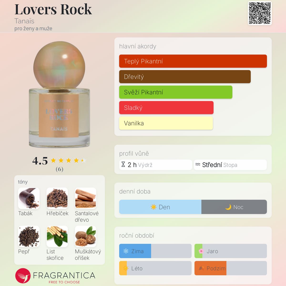 Lovers Rock podle Tanaïs je Woody Spicy vůně pro ženy a muže. Lovers Rock byl/a uveden/a v roce 2015. "Nosem" za touto vůní je tanais. Vrchní tóny jsou Černý pepř a Brazilské růžové dřevo; střední tóny jsouTabák, Hřebíček, List skořice, Muškátový oříšek a Včelí vosk ; základní tóny jsou Santalové dřevo, Bourbonská vanilka, Atlasový cedr, Fazole tonka a Jantar (ambra).