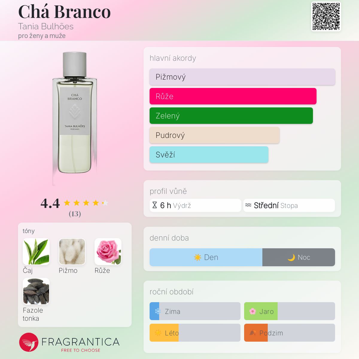 Chá Branco podle Tania Bulhões je Aromatic Fougere vůně pro ženy a muže. Chá Branco byl/a uveden/a v roce 2023. "Nosem" za touto vůní je Regina Paulon Devecchi. Vrchní tón je Bílý čaj ; střední tón jeRůže ; základní tóny jsou Pižmo a Fazole tonka.