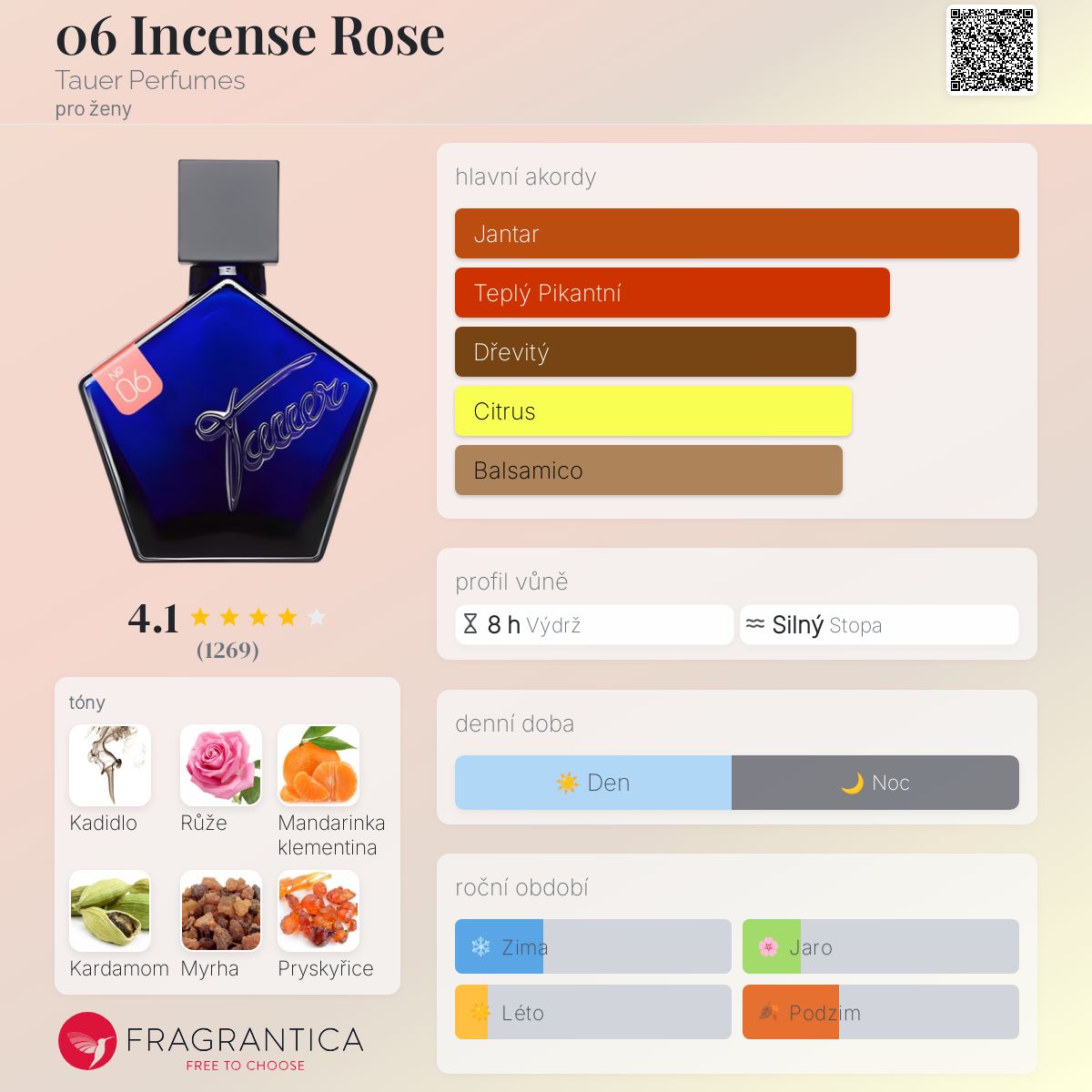 06 Incense Rose podle Tauer Perfumes je Orientální Floral vůně pro ženy. 06 Incense Rose byl/a uveden/a v roce 2008. "Nosem" za touto vůní je Andy Tauer. Vrchní tóny jsou Bulharská růže, Mandarinka klementina, Kardamom a Bergamot; střední tóny jsouKastoreum a Kořen orris ; základní tóny jsou Kadidlo, Myrha, Pryskyřice, Texaský cedr, Labdanum, Vetiver a Pačuli.