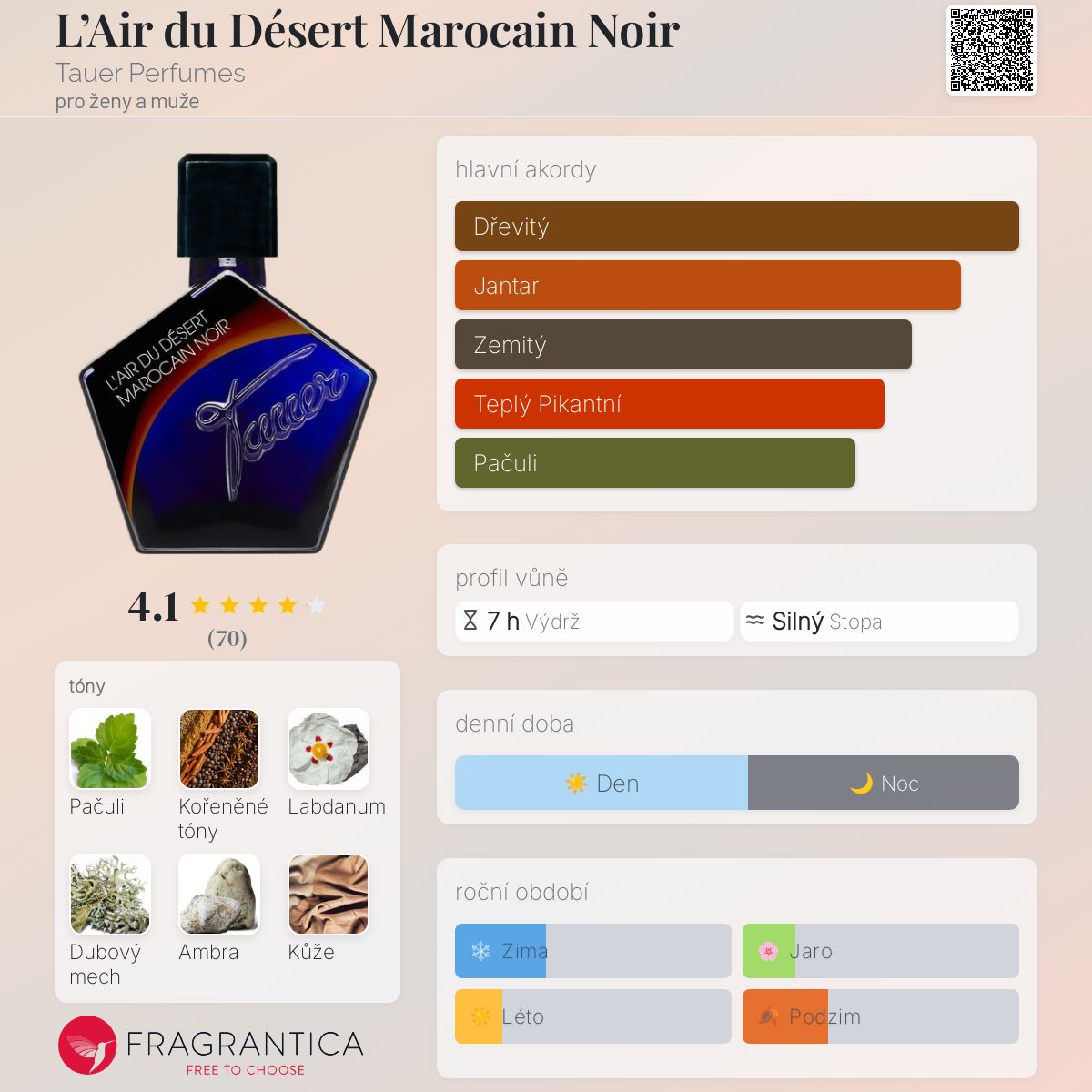 L’Air du Désert Marocain Noir podle Tauer Perfumes je Leather vůně pro ženy a muže. Toto je nová vůně. L’Air du Désert Marocain Noir byl/a uveden/a v roce 2025. "Nosem" za touto vůní je Andy Tauer. Vrchní tóny jsou Koření, Petitgrain, Citrón a Bergamot; střední tóny jsouLabdanum, Kůže a Jasmín ; základní tóny jsou Pačuli, Dubový mech, Ambra, Vetiver a Cedr.
