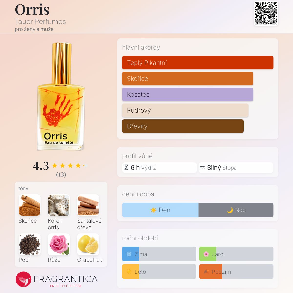 Orris podle Tauer Perfumes je Floral vůně pro ženy a muže. Orris byl/a uveden/a v roce 2006. "Nosem" za touto vůní je Andy Tauer. Vrchní tóny jsou Skořice, Černý pepř a Grapefruit; střední tóny jsouKořen kosatce a Růže ; základní tón je Santalové dřevo.
