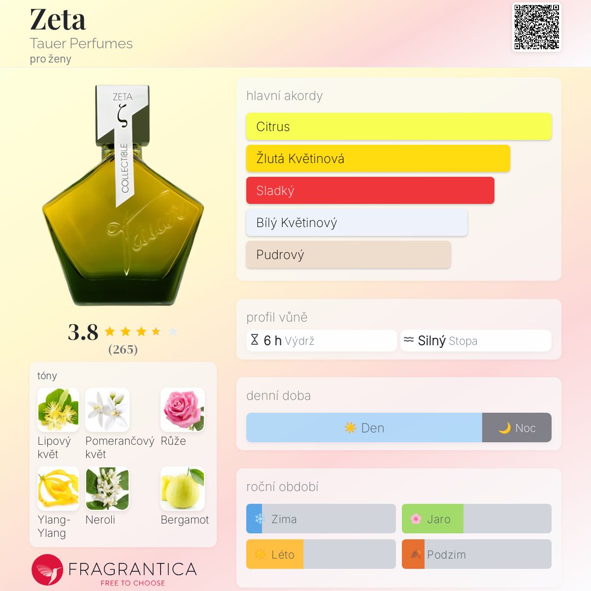 Zeta podle Tauer Perfumes je Floral vůně pro ženy. Zeta byl/a uveden/a v roce 2011. "Nosem" za touto vůní je Andy Tauer. Vrchní tóny jsou Bergamot, Citron amalfi a Pomeranč; střední tóny jsouLipový květ, Květ afrického pomeranče, Růže, Ylang-Ylang a Neroli ; základní tóny jsou Santalové dřevo, Kořen orris a Vanilka.