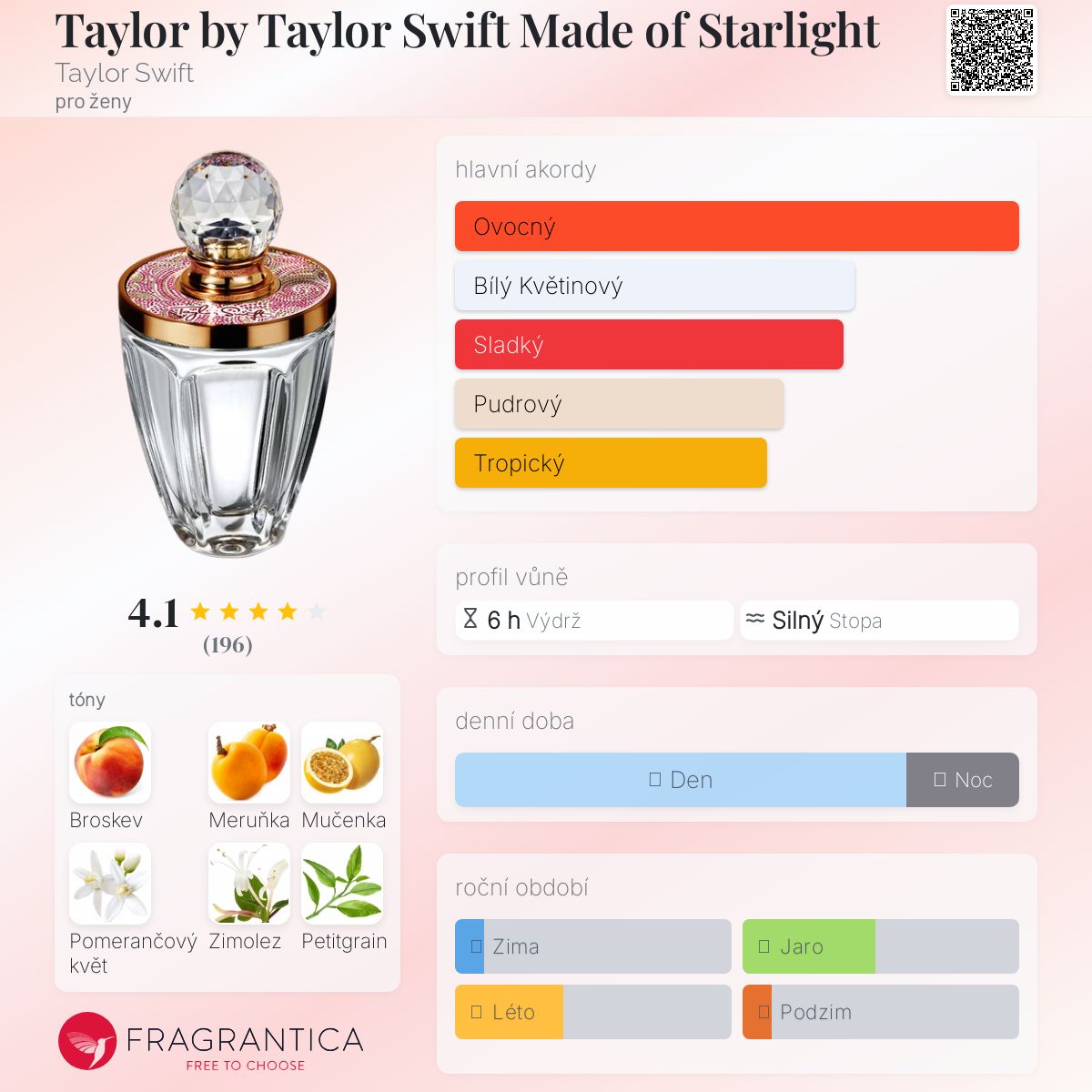 Taylor by Taylor Swift Made of Starlight podle Taylor Swift je Floral Fruity vůně pro ženy. Taylor by Taylor Swift Made of Starlight byl/a uveden/a v roce 2014. Vrchní tóny jsou Meruňka, Mučenka a Mandarinkový list; střední tóny jsouPomerančový květ, Zimolez a Vonokvětka ; základní tóny jsou Broskev, Pižmo a Dřevité tóny.