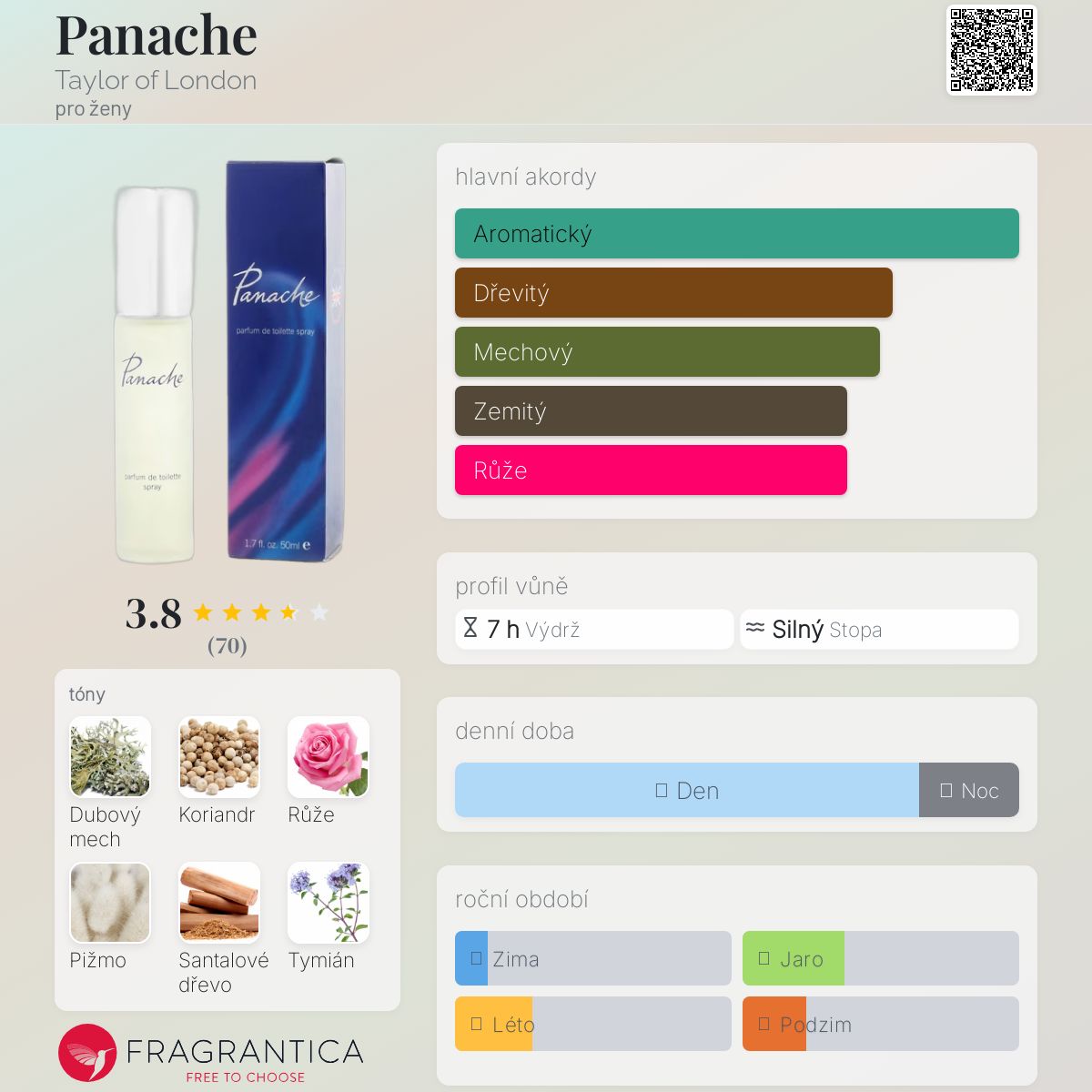 Panache podle Taylor of London je Floral Aldehyde vůně pro ženy. Vrchní tóny jsou Koriandr, Tymián, Citrón a Pomeranč; střední tóny jsouRůže, Pelargónie, Ylang-Ylang, Lilie, Kosatec a Jasmín ; základní tóny jsou Dubový mech, Pižmo, Santalové dřevo a Myrha.