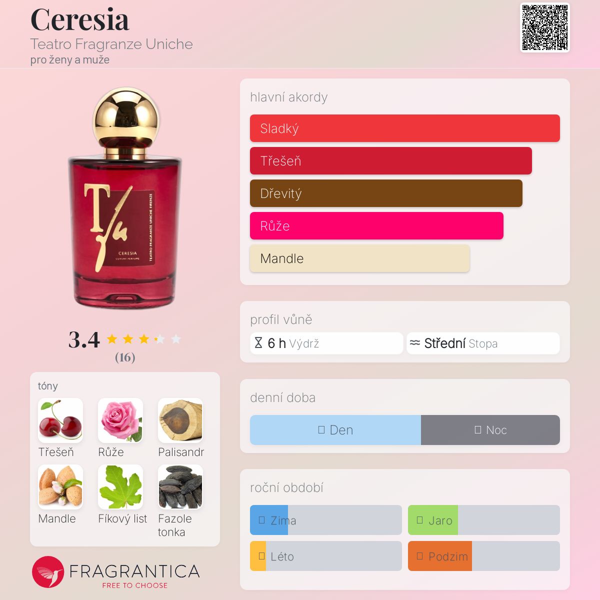 Ceresia podle Teatro Fragranze Uniche je Floral Fruity Gourmand vůně pro ženy a muže. Toto je nová vůně. Ceresia byl/a uveden/a v roce 2024. Vrchní tóny jsou Třešeň, Mandlové mléko, Fíkový list a Bergamot; střední tóny jsouTurecká růže, Palisandr, Fazole tonka a Gardénie ; základní tóny jsou Santalové dřevo, Vanilka a Pižmo.