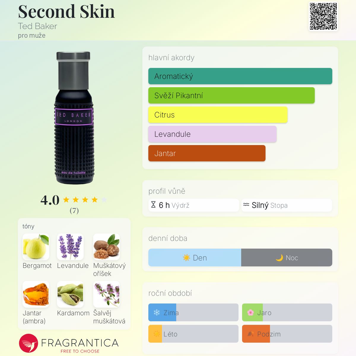 Second Skin podle Ted Baker je Orientální Spicy vůně pro muže. Second Skin byl/a uveden/a v roce 2004. "Nosem" za touto vůní je Alain Astori. Vrchní tóny jsou Bergamot a Kardamom; střední tóny jsouLevandule, Muškátový oříšek a Šalvěj muškátová ; základní tóny jsou Jantar (ambra), Vetiver a Pižmo.