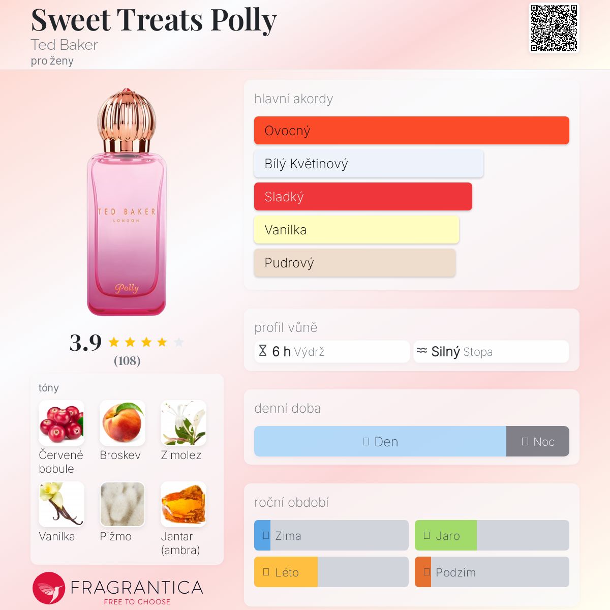 Sweet Treats Polly podle Ted Baker je Floral Fruity vůně pro ženy. Sweet Treats Polly byl/a uveden/a v roce 2012. Vrchní tóny jsou Červené bobule, Broskev a Mandarinka; střední tóny jsouZimolez, Pivoňka a Jasmín ; základní tóny jsou Vanilka, Bílé pižmo a Jantar (ambra).