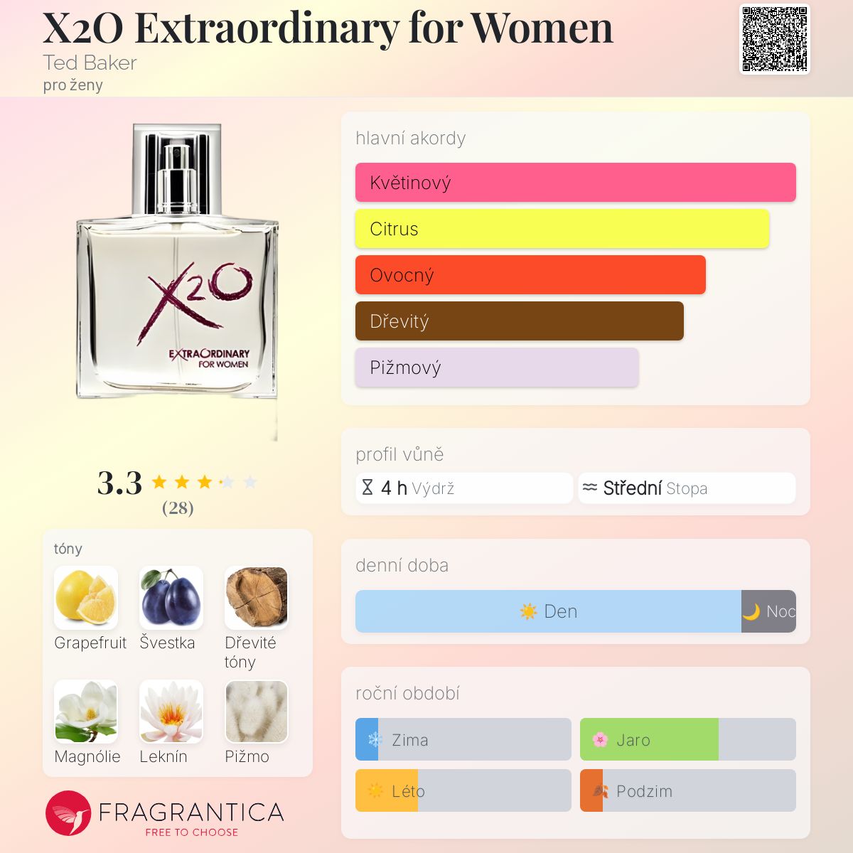 X2O Extraordinary for Women podle Ted Baker je Floral Fruity vůně pro ženy. X2O Extraordinary for Women byl/a uveden/a v roce 2008. "Nosem" za touto vůní je Sophie Labbe. Vrchní tóny jsou Grapefruit a Badyán; střední tóny jsouŠvestka mirabelka, Magnólie a Leknín ; základní tóny jsou Vzácné dřevo a Pižmo.