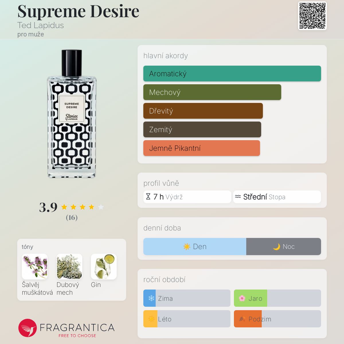 Supreme Desire podle Ted Lapidus je Aromatic Fougere vůně pro muže. Supreme Desire byl/a uveden/a v roce 2020.