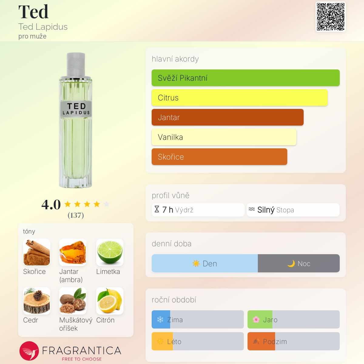 Ted podle Ted Lapidus je Orientální Fougere vůně pro muže. Ted byl/a uveden/a v roce 1999. Vrchní tóny jsou Cedr a Citrón; střední tóny jsouSkořice, Limetka, Muškátový oříšek, Zázvor a Kmín ; základní tóny jsou Jantar (ambra), Fazole tonka, Vanilka a Bílé pižmo.