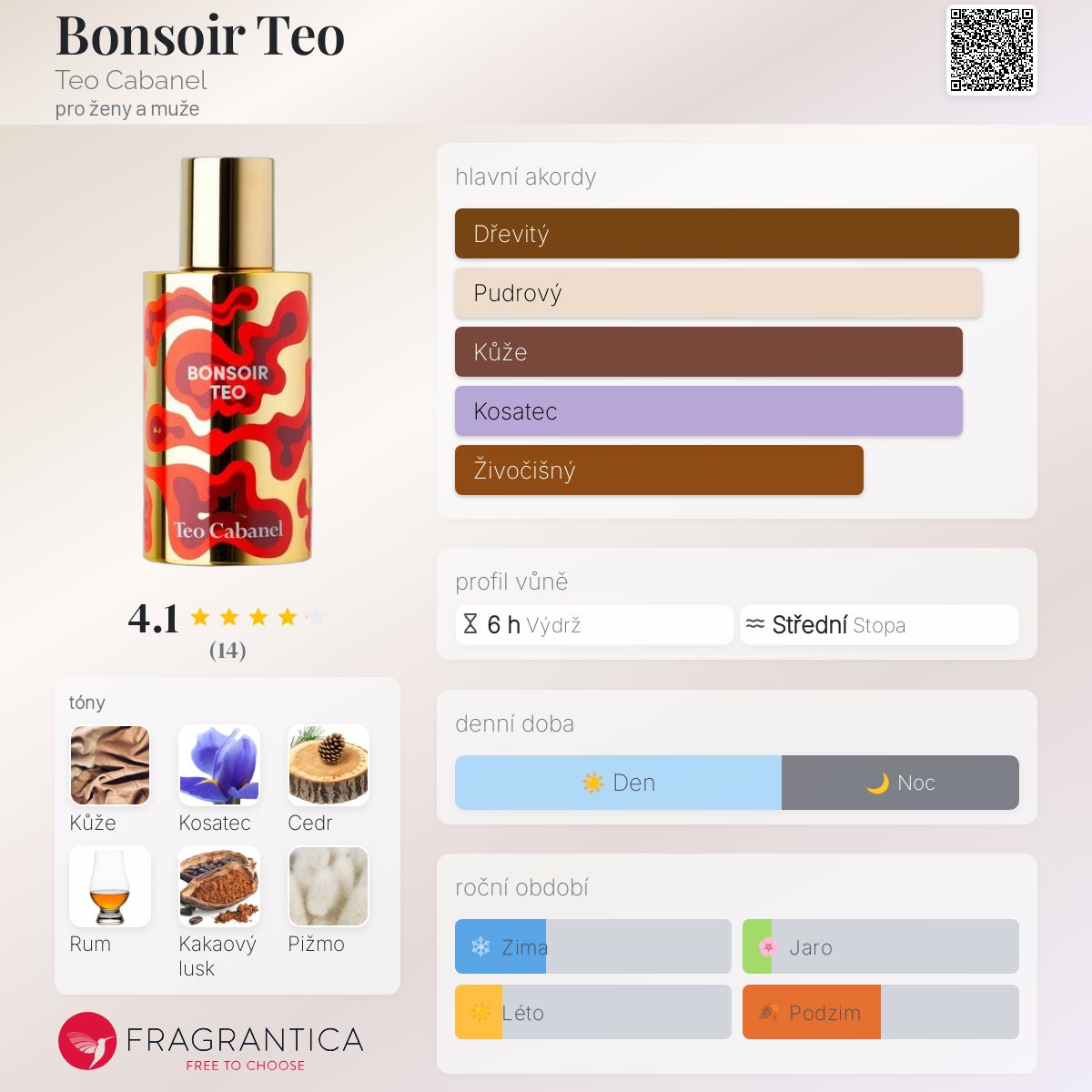 Bonsoir Teo podle Teo Cabanel je Orientální vůně pro ženy a muže. Toto je nová vůně. Bonsoir Teo byl/a uveden/a v roce 2025. "Nosem" za touto vůní je Patrice Revillard. Vrchní tón je Rum ; střední tóny jsouKůže, Kosatec a Kakao ; základní tóny jsou Cedr, Pižmo a Jantar (ambra).