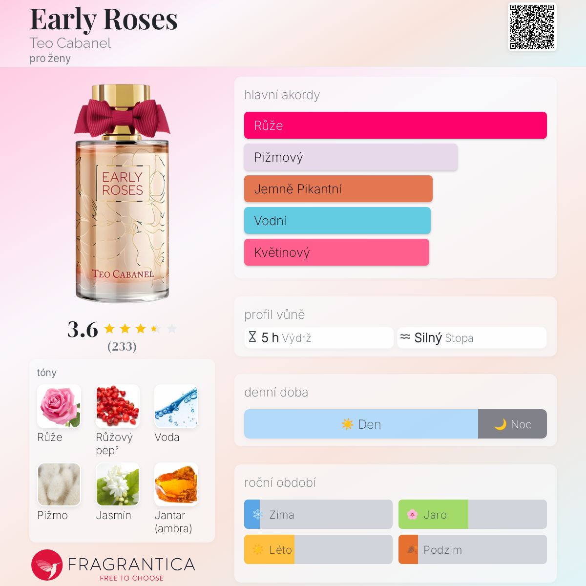 Early Roses podle Teo Cabanel je Floral vůně pro ženy. Early Roses byl/a uveden/a v roce 2010. "Nosem" za touto vůní je Jean-Francois Latty. Vrchní tóny jsou Růže, Vodní tóny a Jasmín; střední tóny jsouBulharská růže, Růžový pepř a Jasmín ; základní tóny jsou Pižmo, Jantar (ambra) a Dřevité tóny.