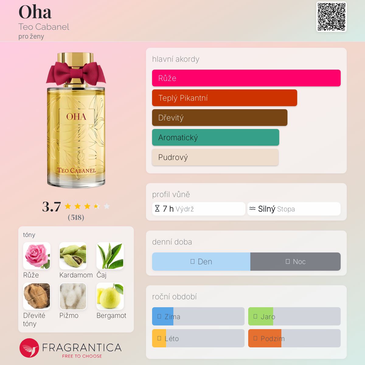 Oha podle Teo Cabanel je Chypre Floral vůně pro ženy. Oha byl/a uveden/a v roce 2005. "Nosem" za touto vůní je Jean-Francois Latty. Vrchní tóny jsou Čaj a Bergamot; střední tóny jsouRůže, Kardamom a Jasmín ; základní tóny jsou Dřevité tóny, Pižmo, Kosatec, Fazole tonka a Vanilka.