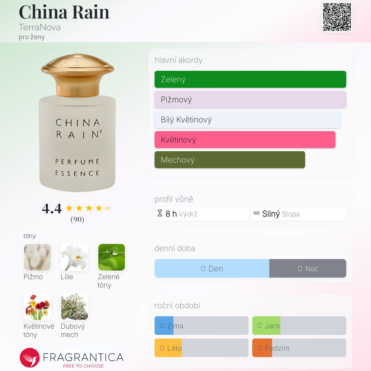 China Rain podle TerraNova je Floral Green vůně pro ženy. Vrchní tón je Zelené tóny ; střední tóny jsouBílá lilie a Květinové tóny ; základní tóny jsou Pižmo a Mech.