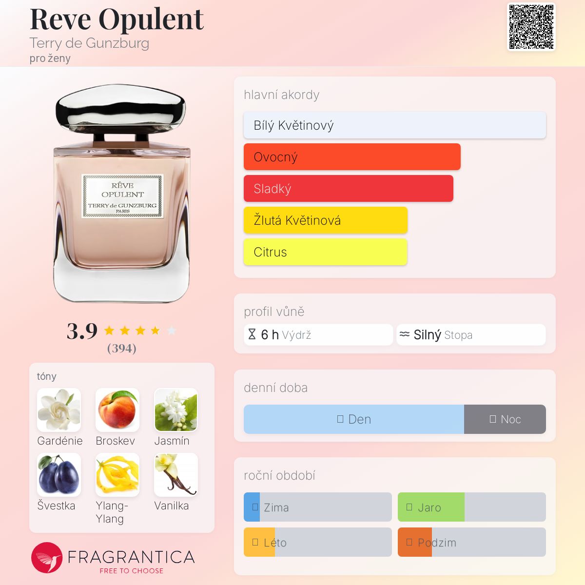 Reve Opulent podle Terry de Gunzburg je Floral vůně pro ženy. Reve Opulent byl/a uveden/a v roce 2012. Vrchní tóny jsou Bílá broskev, Švestka a Mandarinka; střední tóny jsouGardénie, Egyptský jasmín, Jasmín Sambac, Ylang-Ylang, Pomerančový květ, Turecká růže, Růžový olej a Skořice ; základní tóny jsou Vanilka a Pižmo.