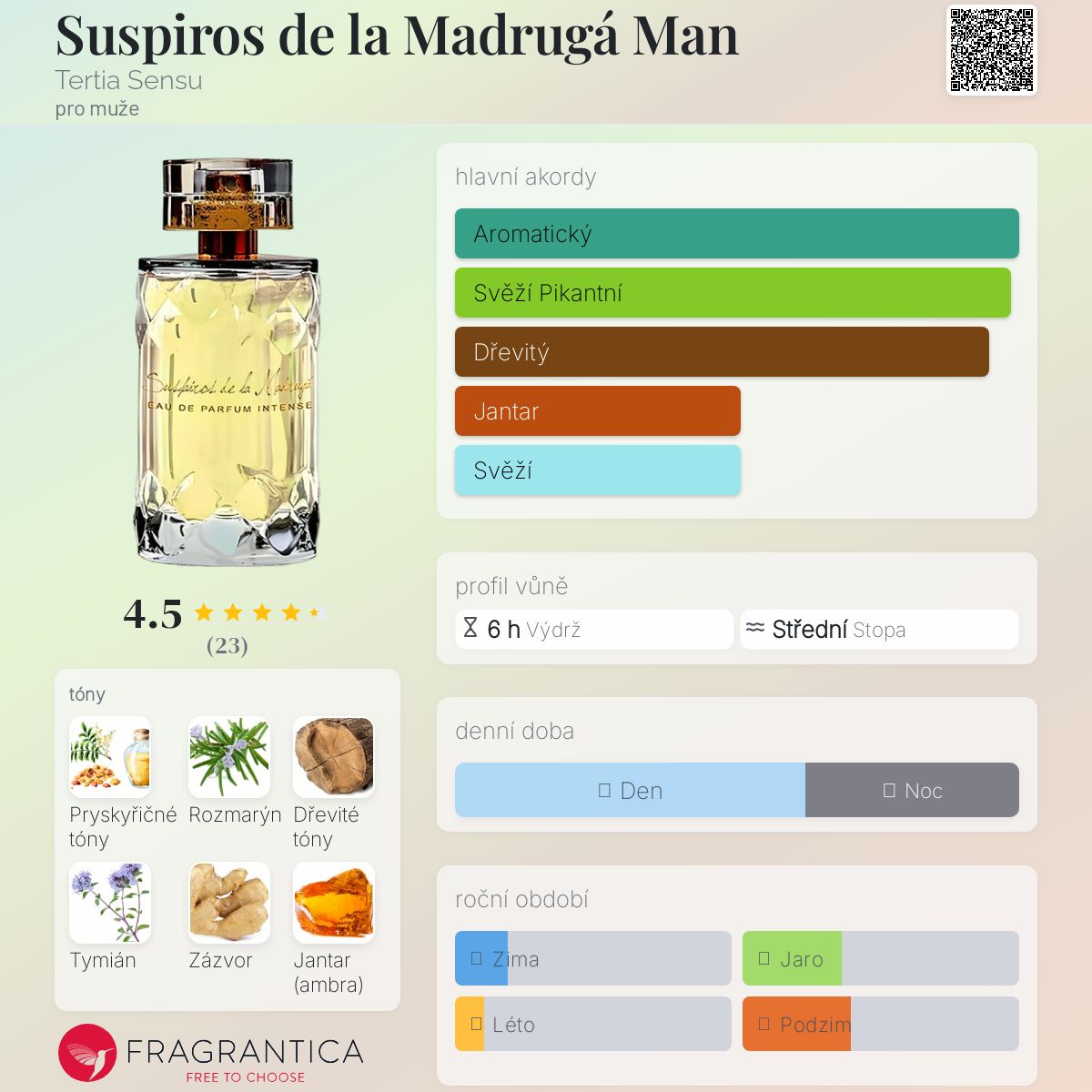 Suspiros de la Madrugá Man podle Tertia Sensu je Woody Aromatic vůně pro muže. Suspiros de la Madrugá Man byl/a uveden/a v roce 2015. Vrchní tóny jsou Rozmarýn, Tymián a Koření; střední tóny jsouPryskyřičné tóny, Dřevité tóny a Zázvor ; základní tón je Jantar (ambra).