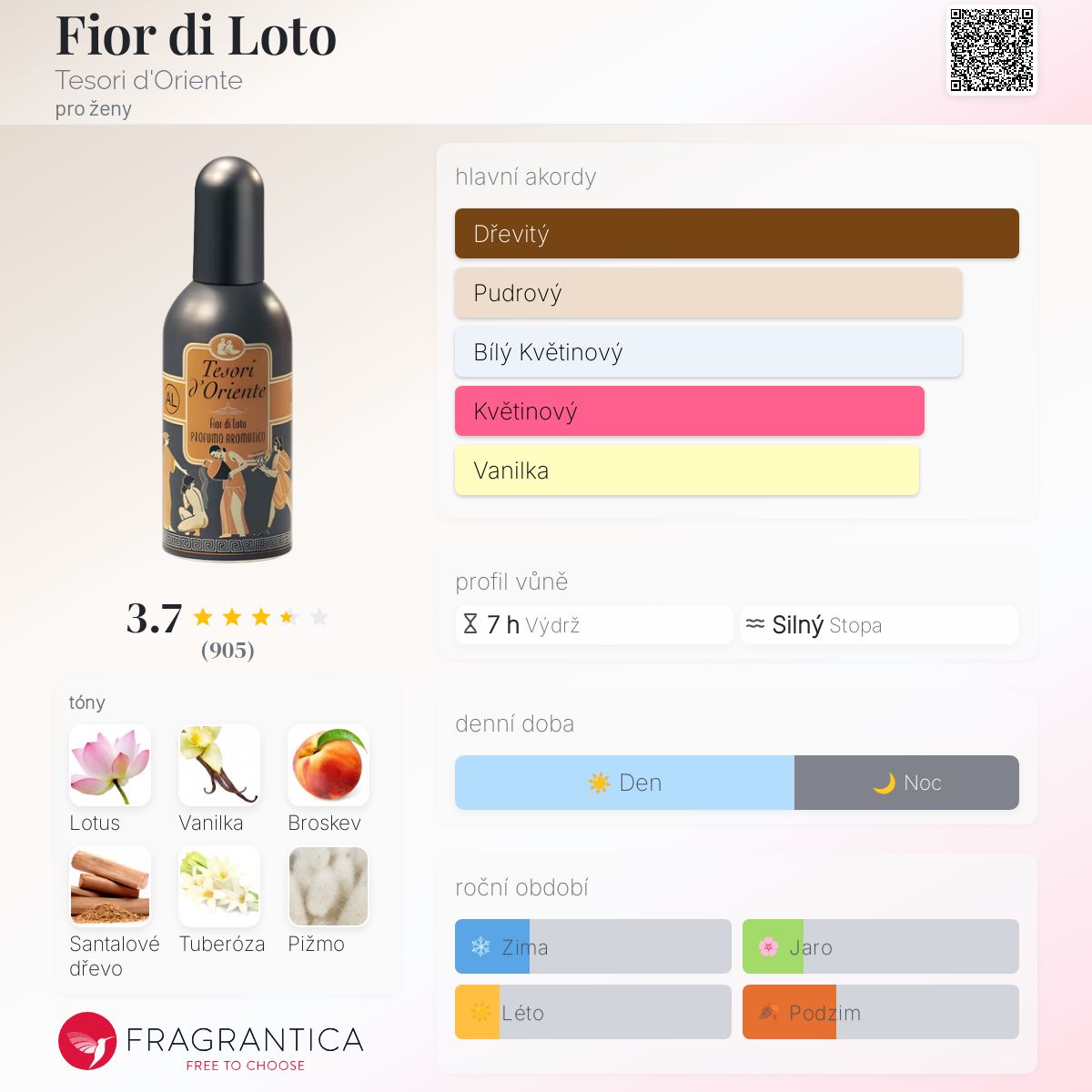 Fior di Loto podle Tesori d'Oriente je Orientální Floral vůně pro ženy. Vrchní tóny jsou Broskev, Pomeranč a Růže; střední tóny jsouLotus, Tuberóza, Jasmín a Konvalinka ; základní tóny jsou Vanilka, Santalové dřevo, Pižmo a Dřevité tóny.