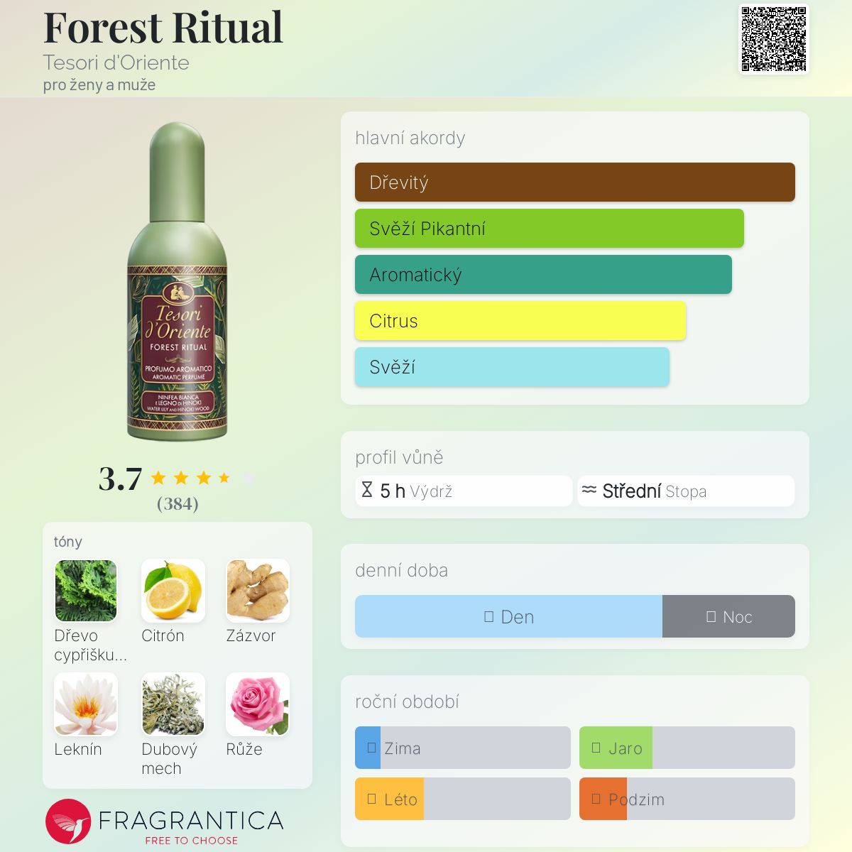Forest Ritual podle Tesori d'Oriente je Aromatic Green vůně pro ženy a muže. Forest Ritual byl/a uveden/a v roce 2022. Vrchní tóny jsou Citrón a Zázvor; střední tóny jsouLeknín a Růže ; základní tóny jsou Dřevo cypřišku tupolistého, Mech a Jantar (ambra).