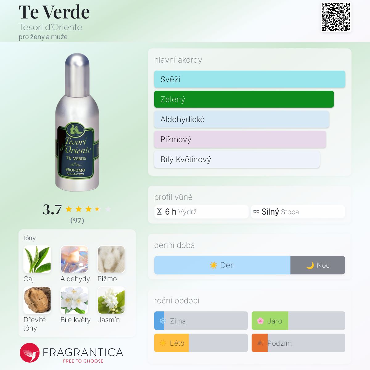 Te Verde podle Tesori d'Oriente je Orientální Spicy vůně pro ženy a muže. Vrchní tóny jsou Aldehydy, Bílé květy a Jasmín; střední tóny jsouZelený čaj a Růže ; základní tóny jsou Pižmo a Dřevité tóny.