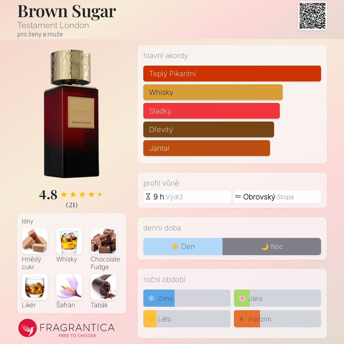 Brown Sugar podle Testament London je vůně pro ženy a muže. Toto je nová vůně. Brown Sugar byl/a uveden/a v roce 2024. Vrchní tóny jsou Hnědý cukr, Whisky, Čokoládový fondán a Likér; střední tóny jsouŠafrán, Skořice, Tabák, Pačuli, Hřebíček, Agarové dřevo (oud) a Olibanum ; základní tóny jsou Jantar (ambra), Kůže, Pryskyřice, Pižmo a Dubový mech.