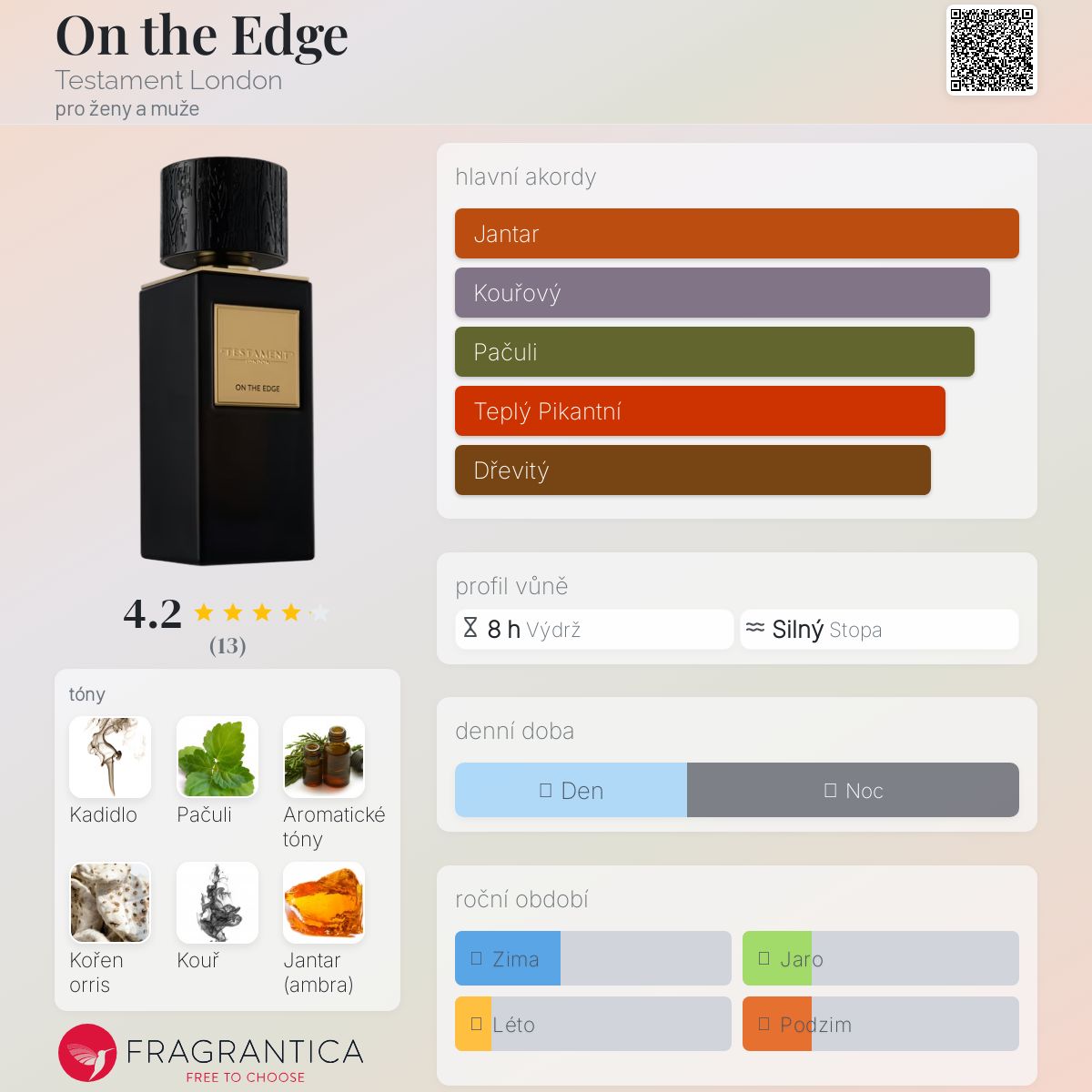 On the Edge podle Testament London je vůně pro ženy a muže. On the Edge byl/a uveden/a v roce 2023. "Nosem" za touto vůní je Chris Maurice. Vrchní tóny jsou Kadidlo, Aromatické tóny a Kouř; střední tóny jsouOrris a Jantar (ambra) ; základní tóny jsou Pačuli a Pižmo.