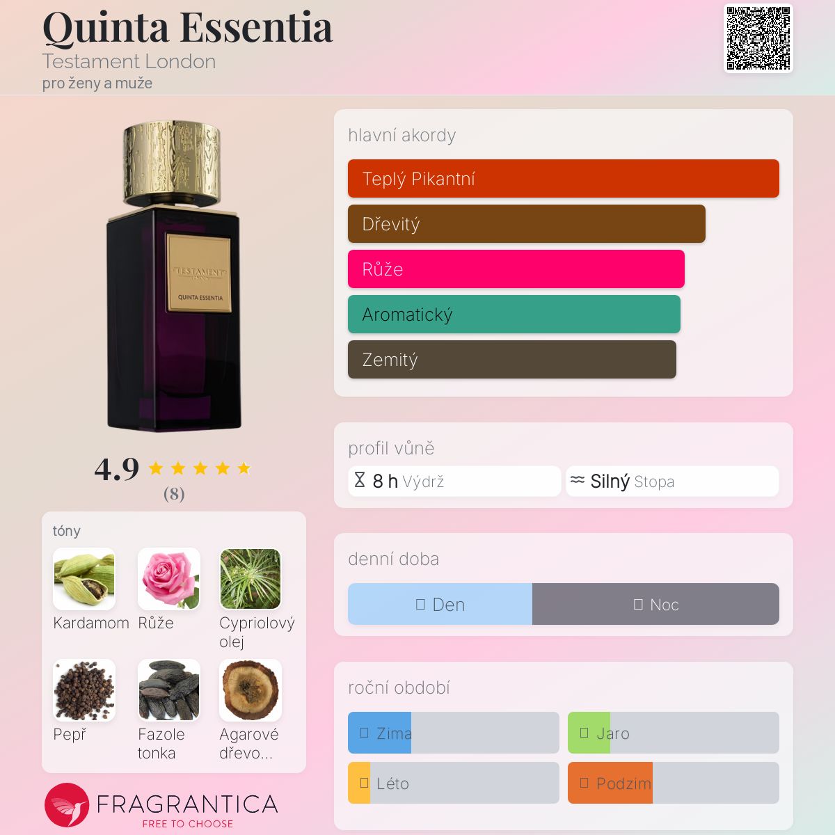 Quinta Essentia podle Testament London je vůně pro ženy a muže. Quinta Essentia byl/a uveden/a v roce 2023. "Nosem" za touto vůní je Chris Maurice. Vrchní tóny jsou Kardamom, Růže a Pepř; střední tóny jsouRůže, Cypriolový olej, Jasmín a Pačuli ; základní tóny jsou Fazole tonka, Agarové dřevo (oud), Vetiver a Vanilka.