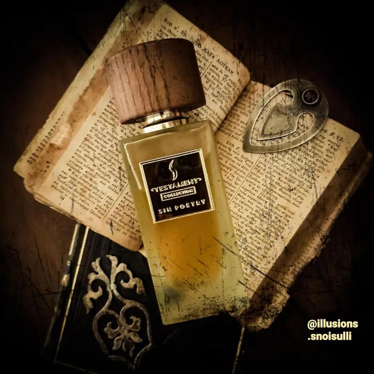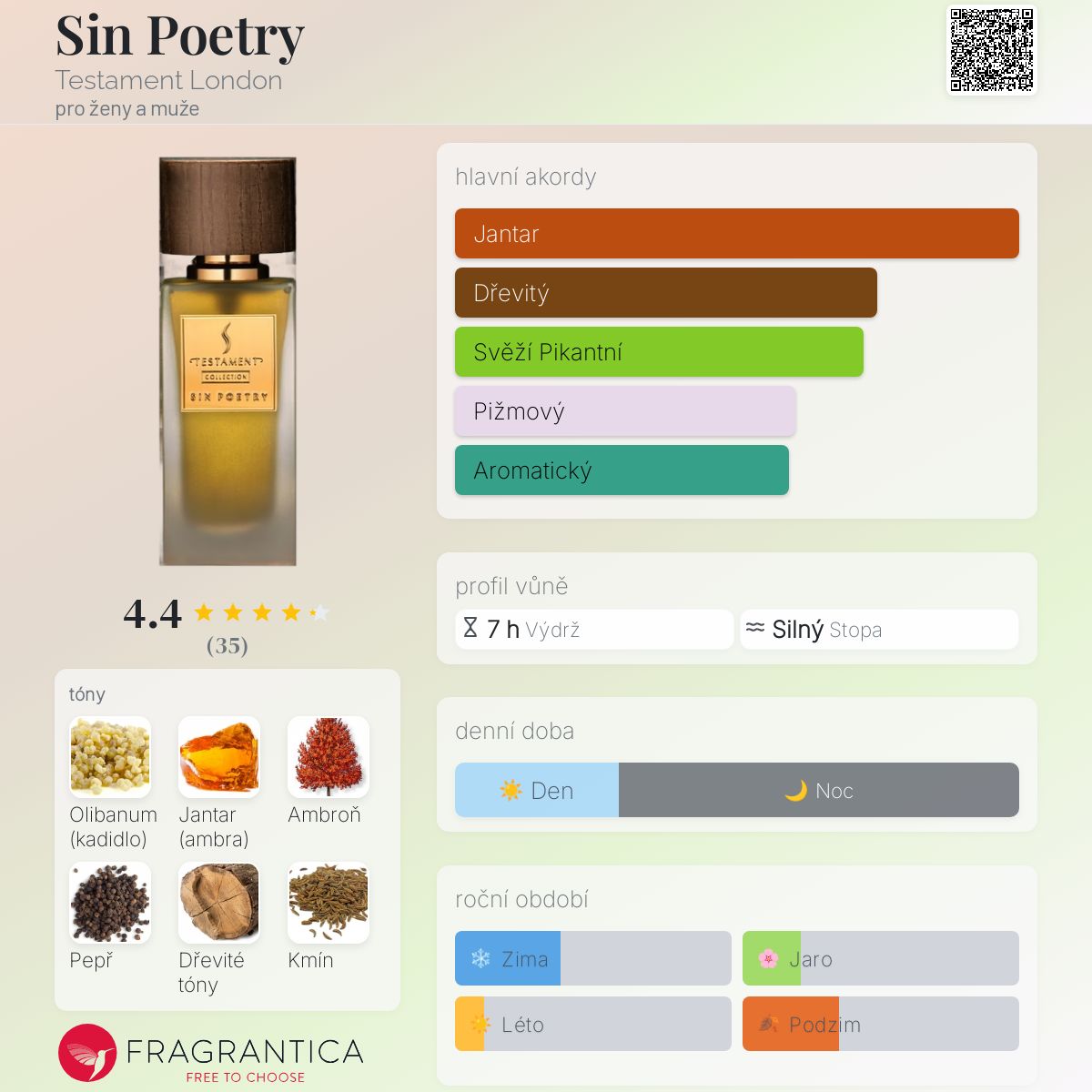 Sin Poetry podle Testament London je Woody Spicy vůně pro ženy a muže. Sin Poetry byl/a uveden/a v roce 2018. Vrchní tóny jsou Černý pepř, Kmín, Růžový pepř, Tymián, Skořice a Citrón; střední tóny jsouOlibanum, Cedr a Vetiver ; základní tóny jsou Jantar (ambra), Ambroň, Dřevité tóny, Atlasový cedr, Pižmo, Kašmír a Labdanum.